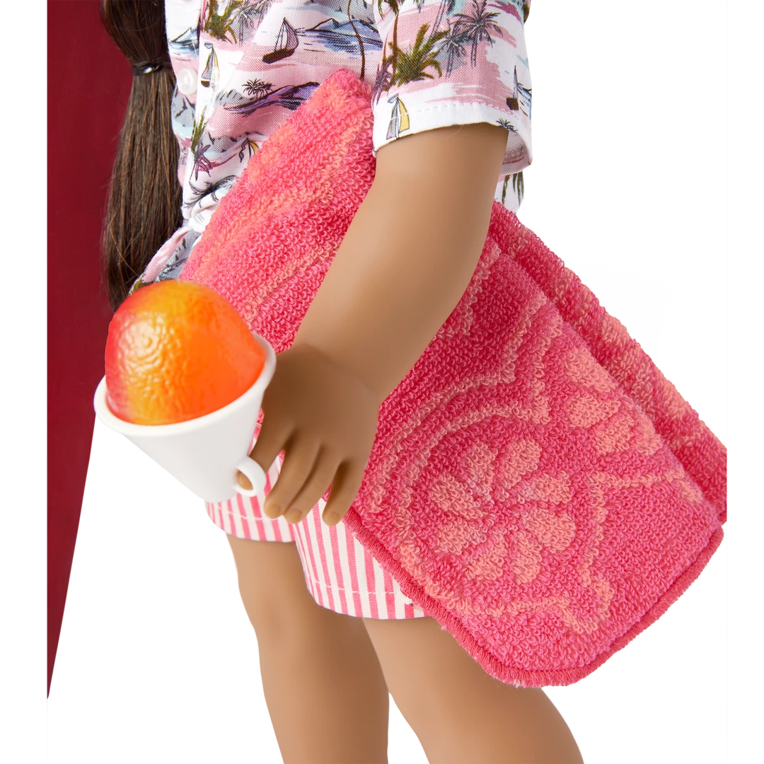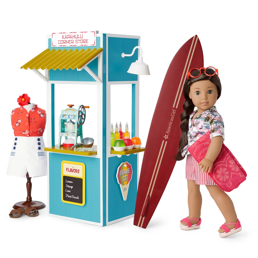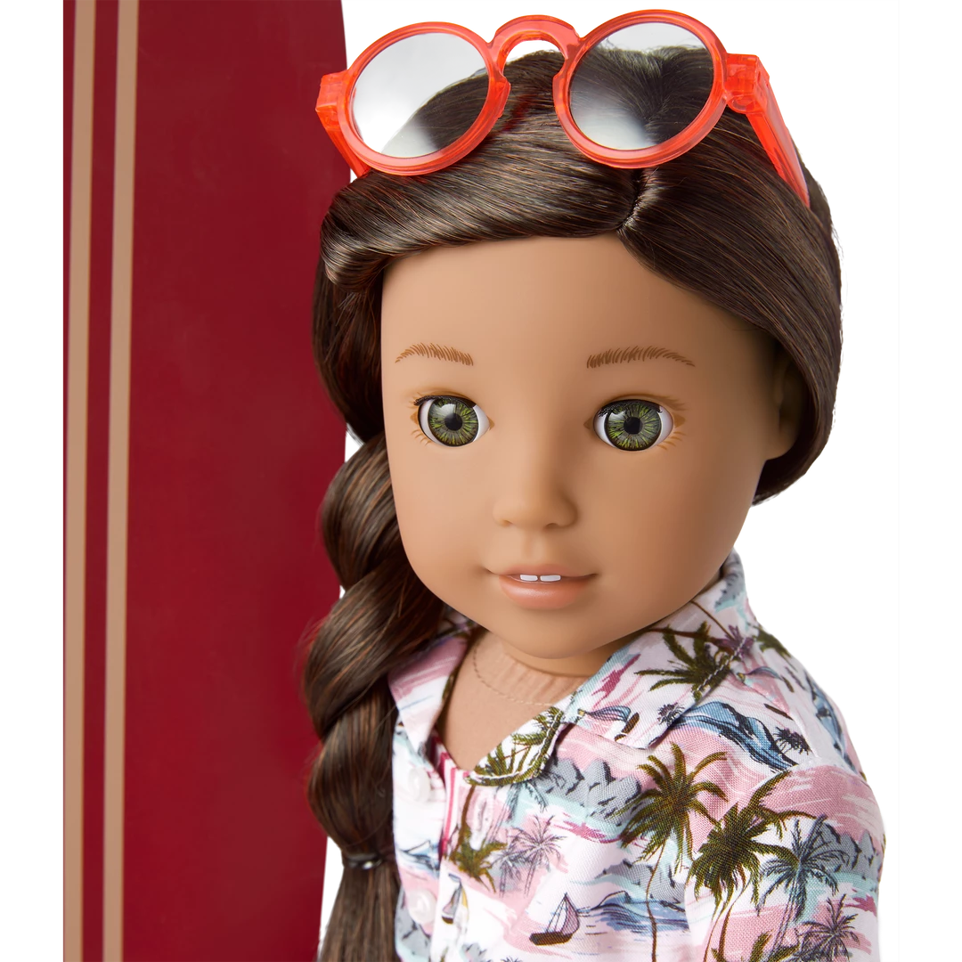 Nanea’s™ Beach Accessories for 18-inch Dolls: A wooden surfboard, a button-front shirt to wear over her swimsuit, sunglasses, and a serving of pretend shave ice