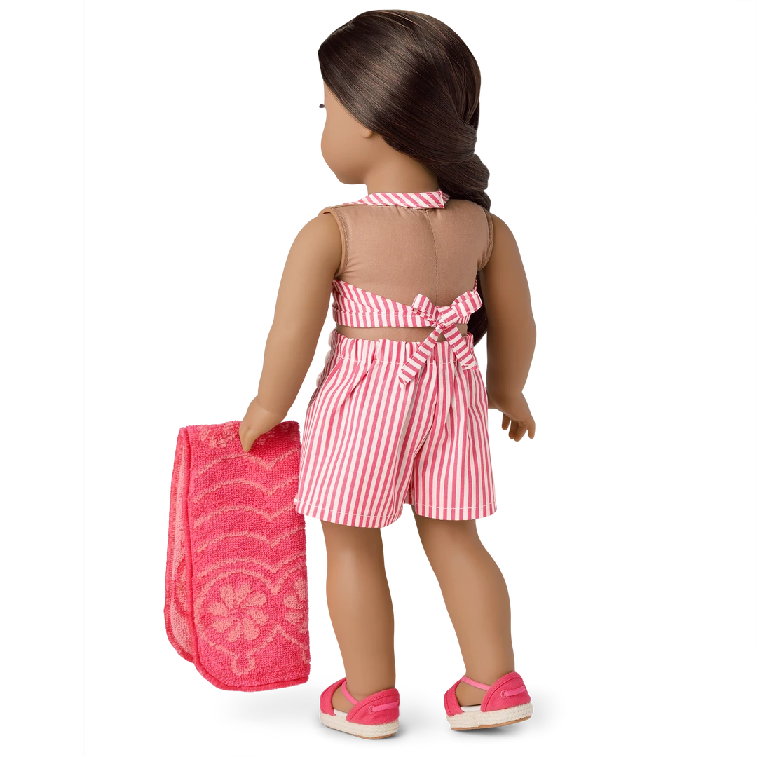 Nanea’s™ Two-Piece Swimsuit for 18-inch Dolls: A 1940s halter-style swim top with straps that tie into a bow at mid-back, plus swim shorts, espadrille shoes, and a towel