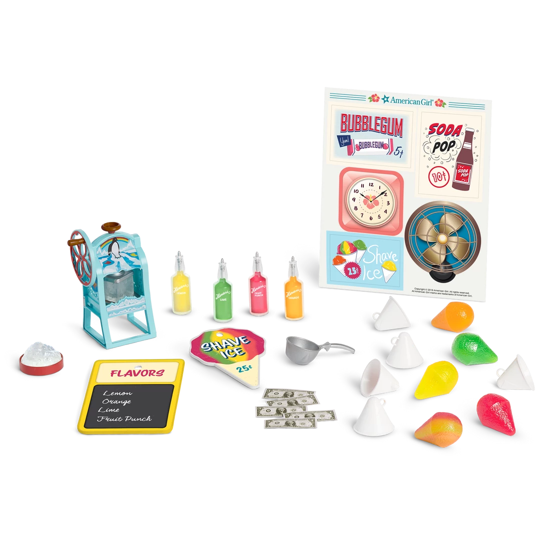 Nanea’s Shave Ice Shop: A colorful shave ice stand with an awning, counters, and a lamp; plus a 1940s-style ice machine, shave ice, syrup, and more