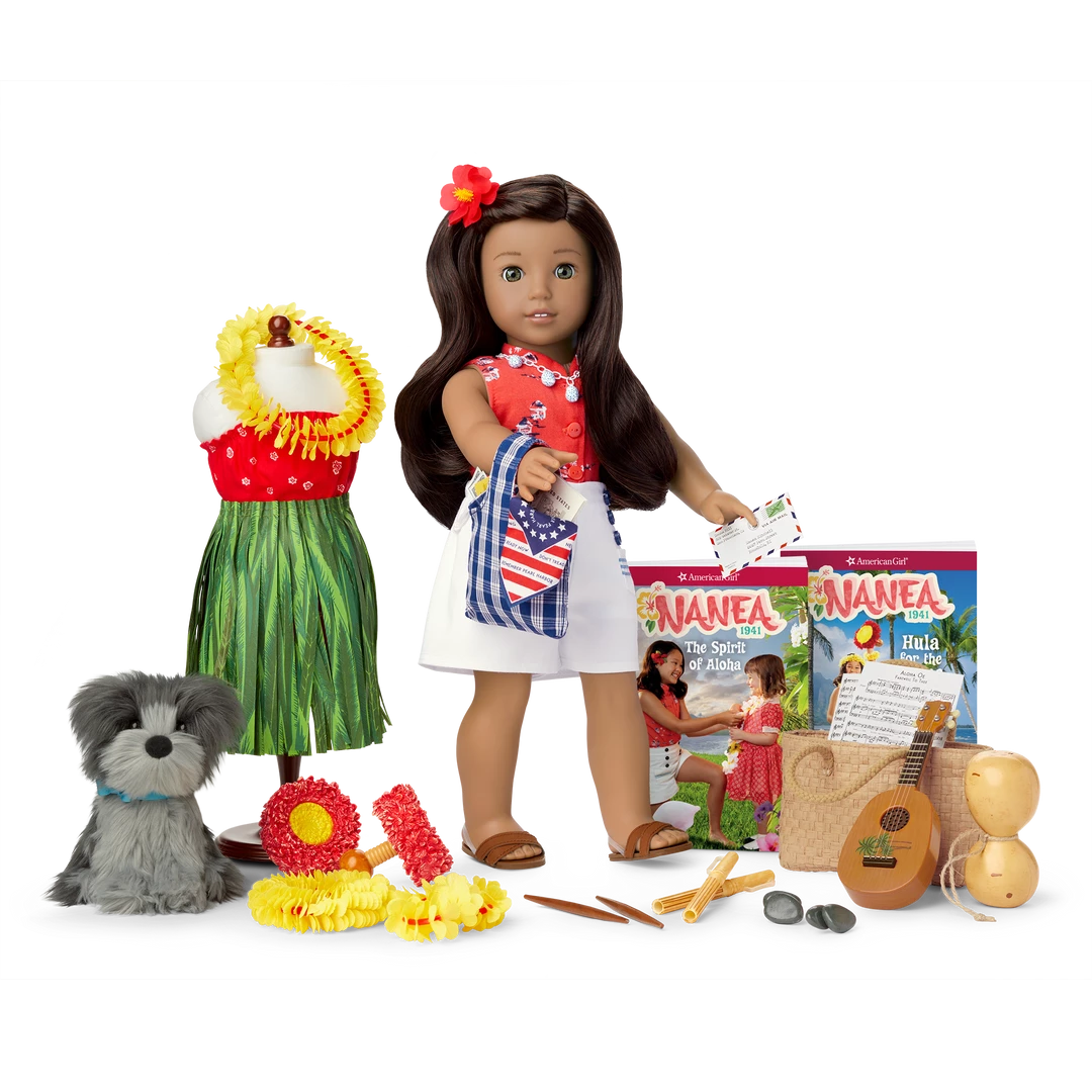 This collection includes everything girls need to play out Nanea’s adventures! Growing up in Hawaii in the 1940s meant helping her community after the Pearl Harbor bombing, learning to hula from her grandmother Tutu, and playing with her pup, Mele.