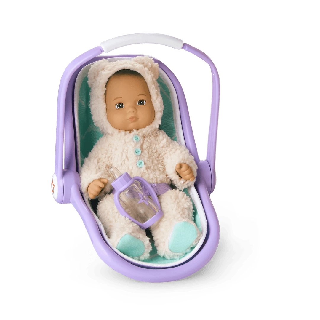 Corinne’s™ Baby Brother, Blix™: A baby doll with brown eyes and brown painted hair, a bear bodysuit, and a cloth diaper, plus a baby carrier with a soft fabric pad, and a pretend bottle