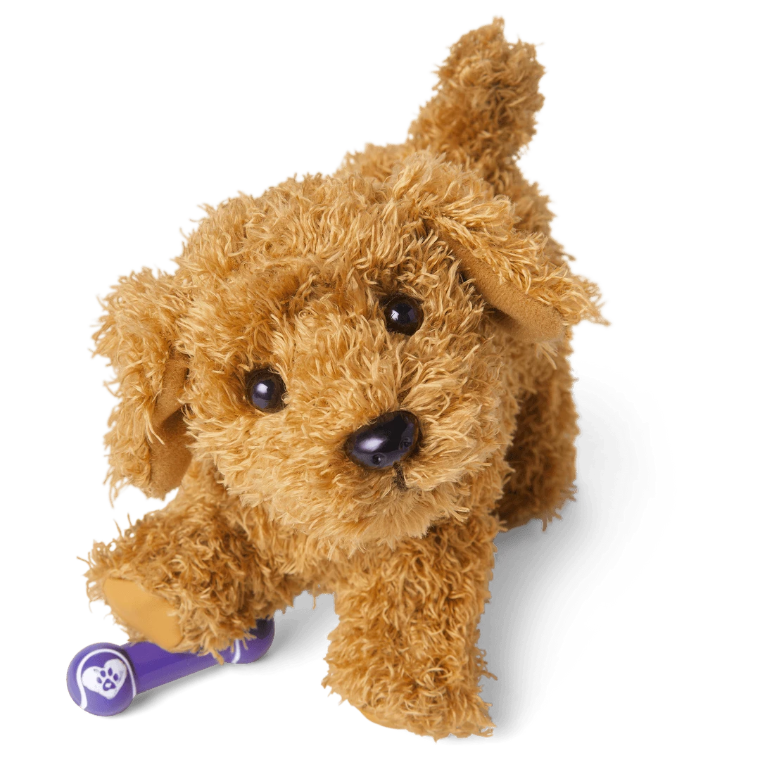 When someone needs help, Daffodil Doodle™ is the first to lend a paw. This posable Labradoodle dog has short, curly golden-brown fur, brown eyes, and a magnetic mouth to hold her barbell toy. Plus, her box can be transformed into a pet house for the perfect napping spot after a day of play!