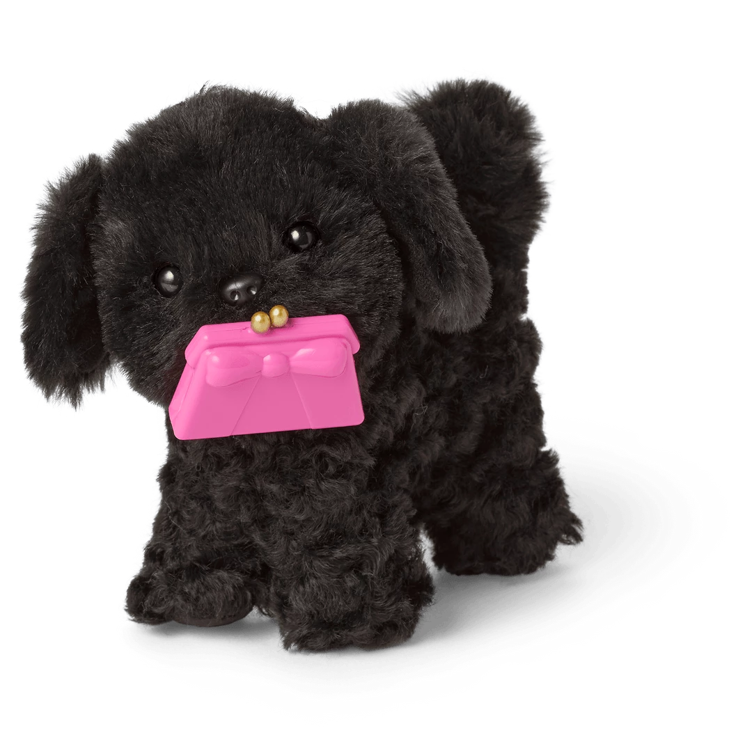 Shi-Poo Sweetie Dog for 18-inch Dolls: This posable black dog has a mix of curly and straight fur, a curly tail, and brown eyes. Her magnetic mouth is perfect for holding her purse toy. Plus, her box can be transformed into a pet house!