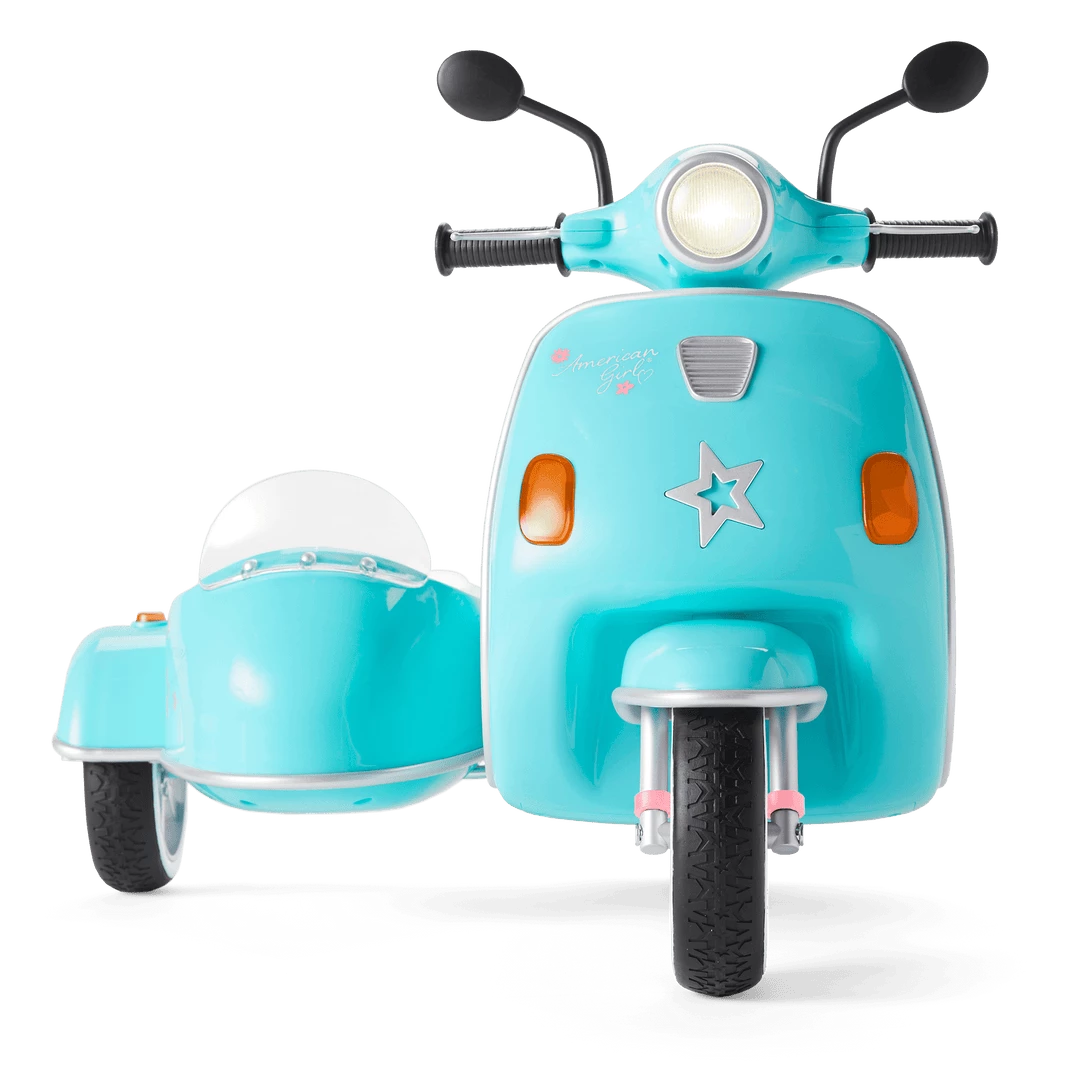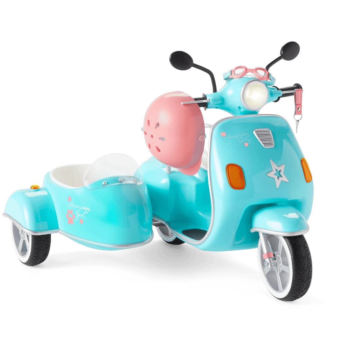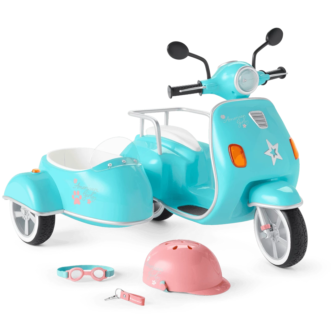- A light-blue classic-styled scooter with a sidecar and protective windscreen that fits any American Girl® posable doll-sized pet. It has a built-in glovebox and working headlight, taillights, and horn, plus a music button that plays three songs.