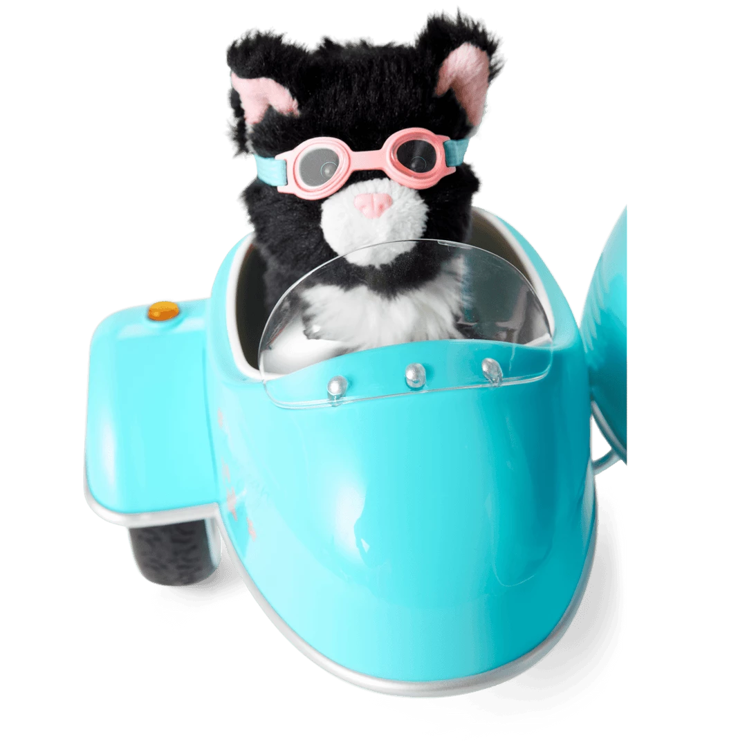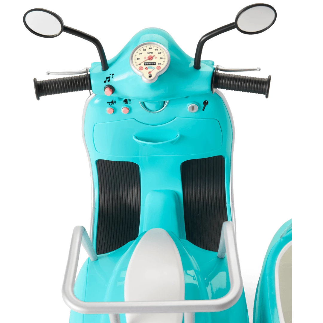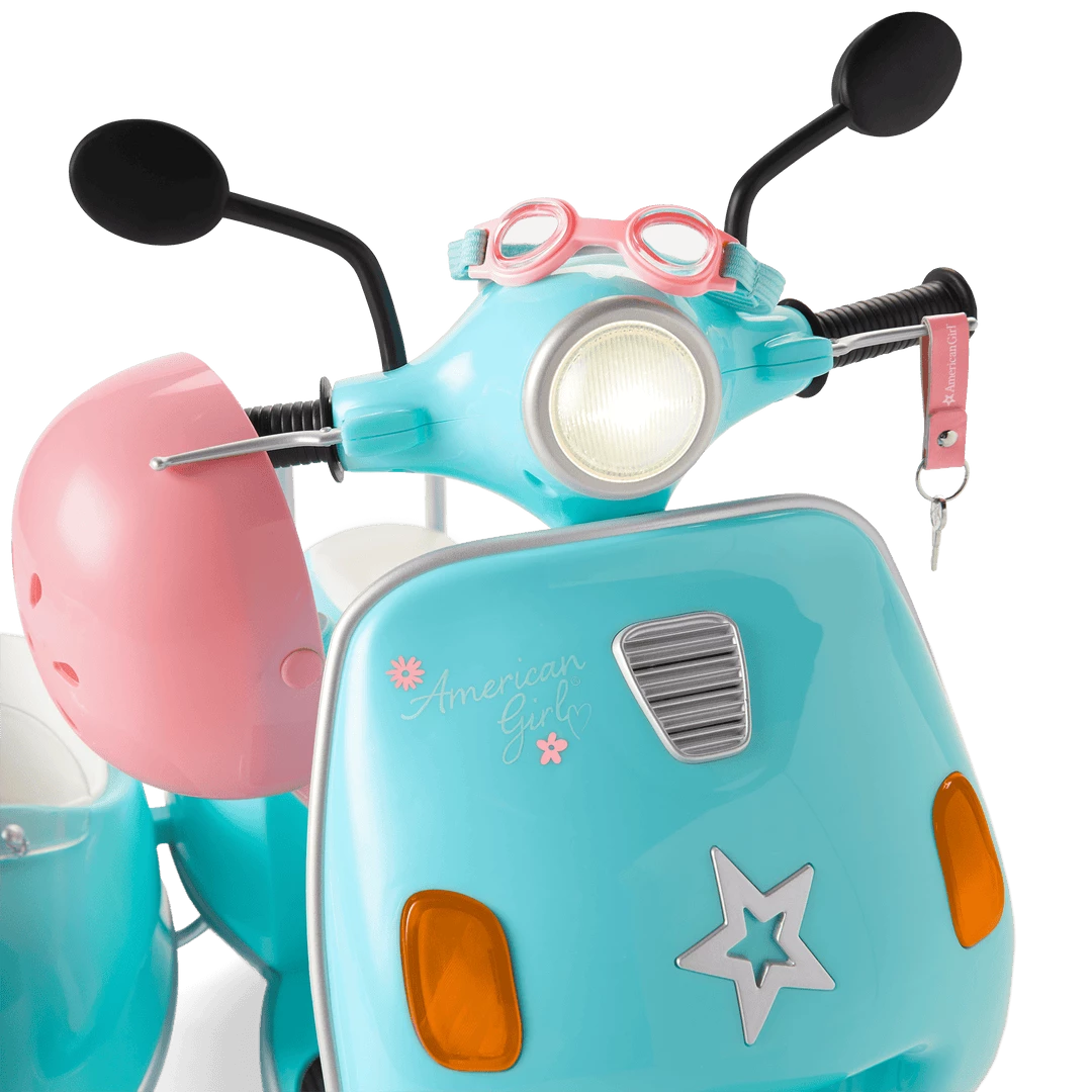 - A light-blue classic-styled scooter with a sidecar and protective windscreen that fits any American Girl® posable doll-sized pet. It has a built-in glovebox and working headlight, taillights, and horn, plus a music button that plays three songs.