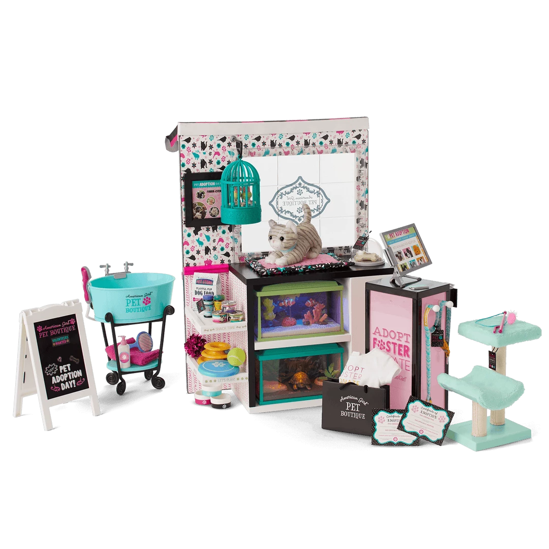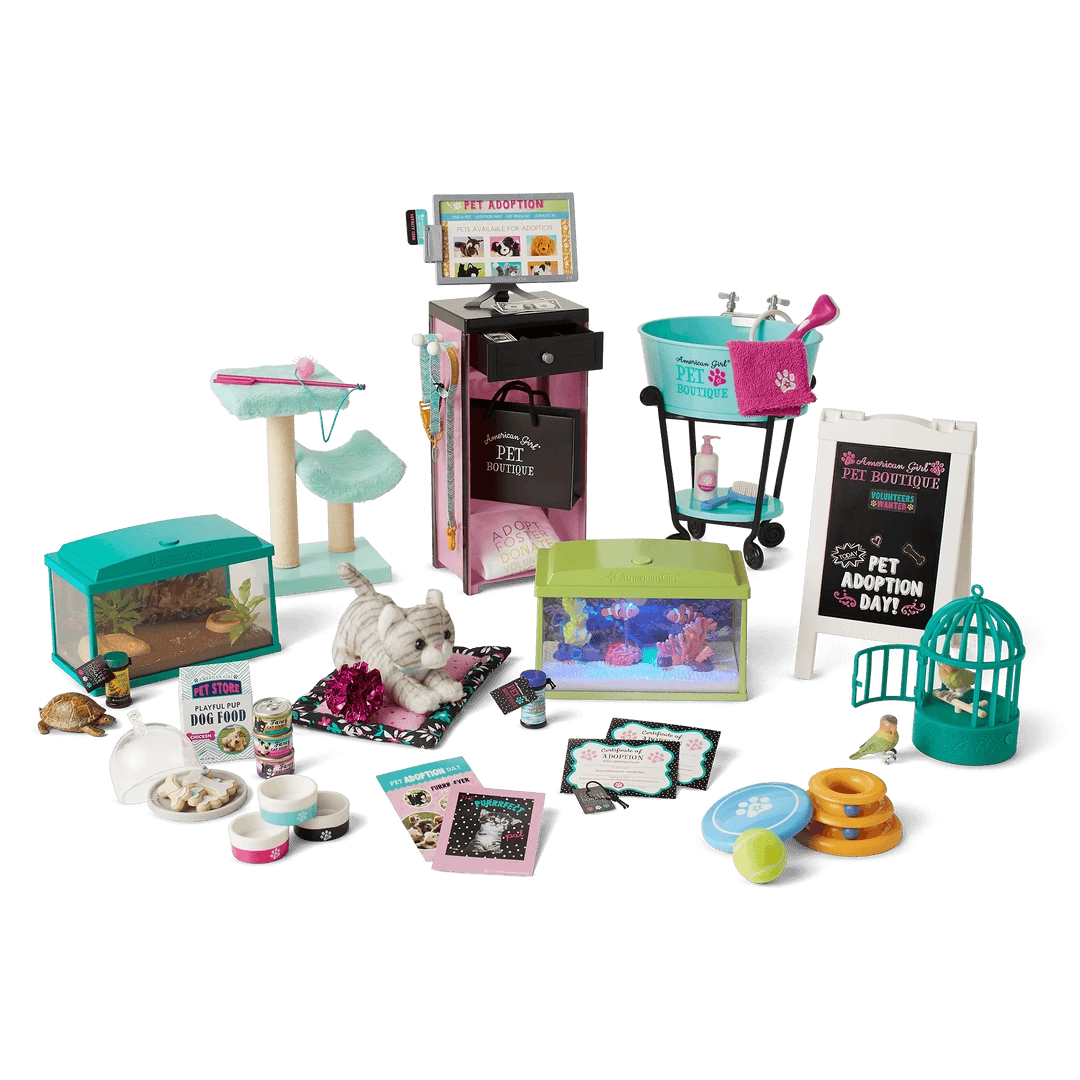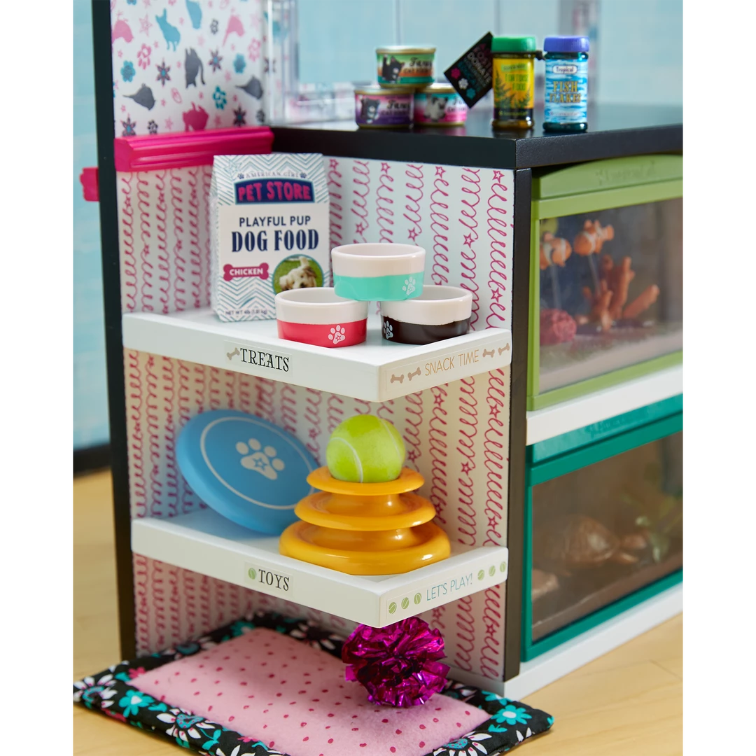 This sweet pet boutique is stocked with everything a doll needs to take care of furry, feathered, and finned friends!