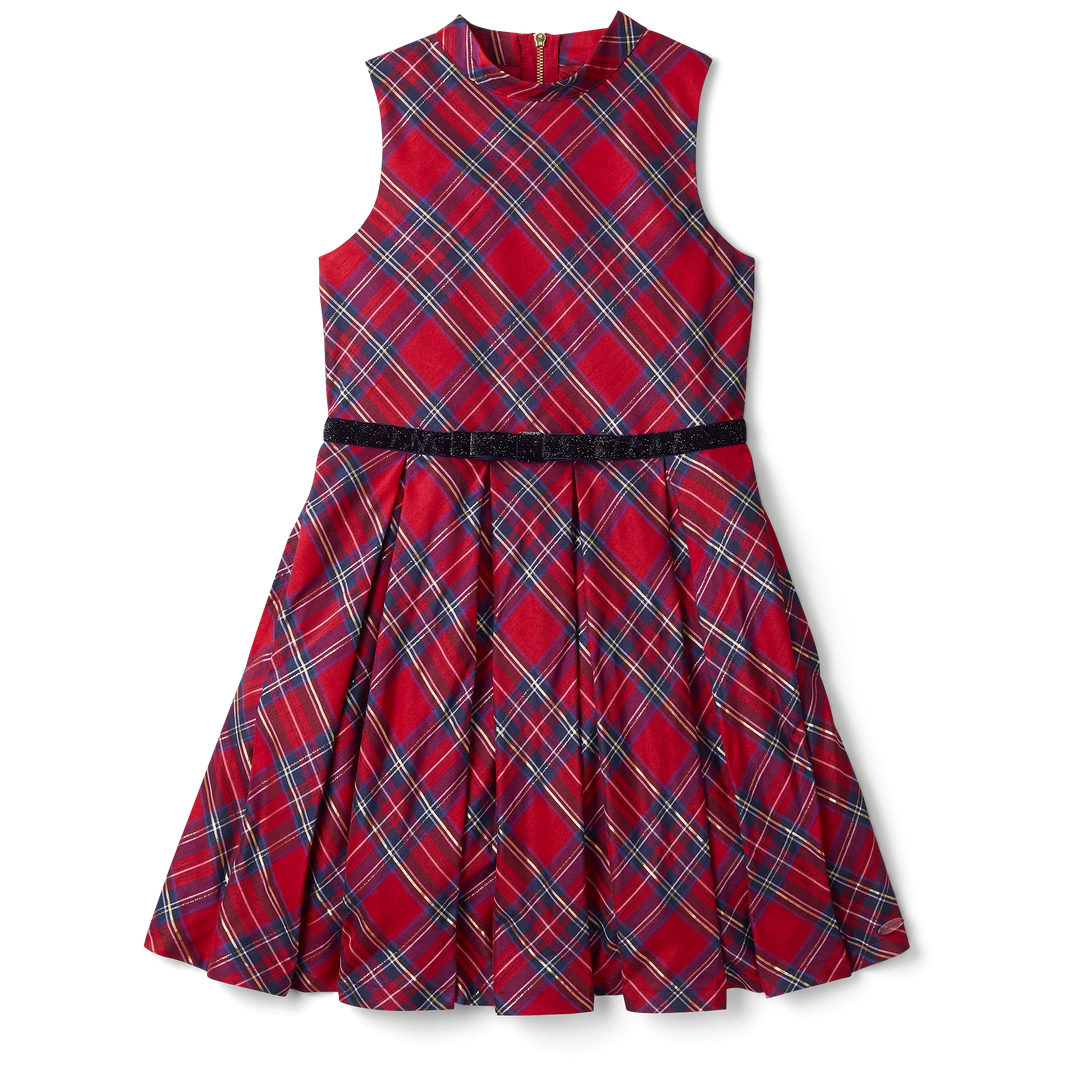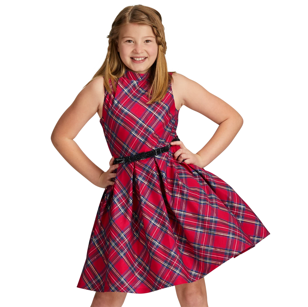 Just like the doll-sized version, this plaid taffeta sleeveless dress has a shimmer of gold woven throughout. Perfect for parties or family pictures, it has a mock neck, a full skirt with inverted pleats, pockets at the side seam, and a velvet ribbon at the waist. Polyester. Imported. Multicolor. Sizes 6-16.