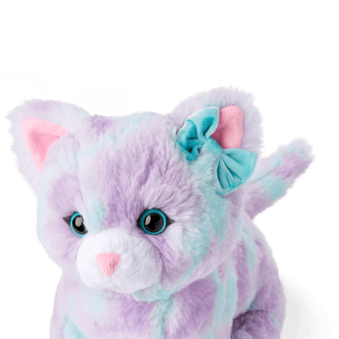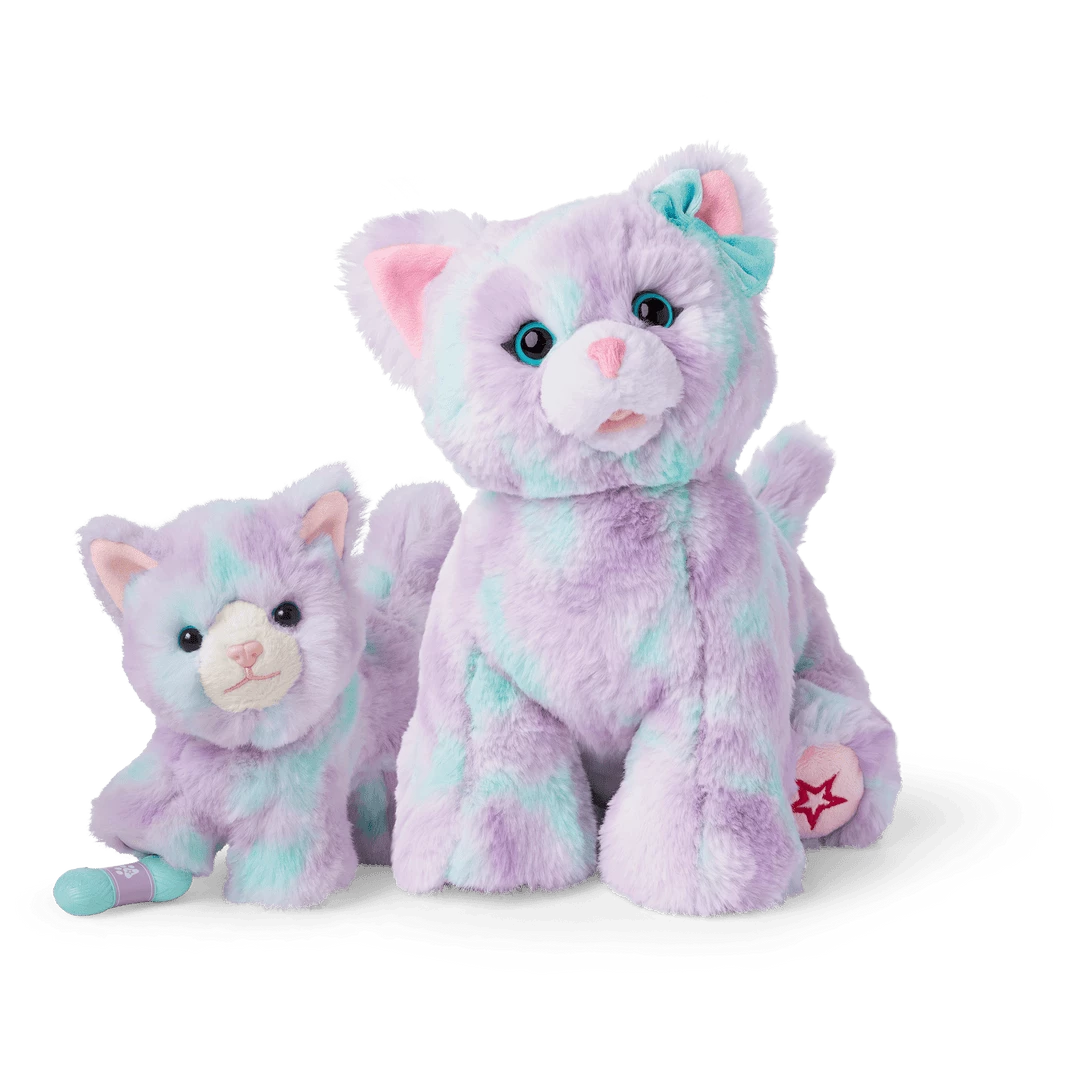 Purrpley Pink Kitty Cat Plush for Girls: A girl-sized soft and cuddly cat plush with multicolor pastel fur and movable limbs so she can sit or lie down. Girls will love her blue velvety ear bow, open mouth with her tongue showing, and the embroidered American Girl® star on her back foot. Everyone will love that she’s made with more sustainable materials.
