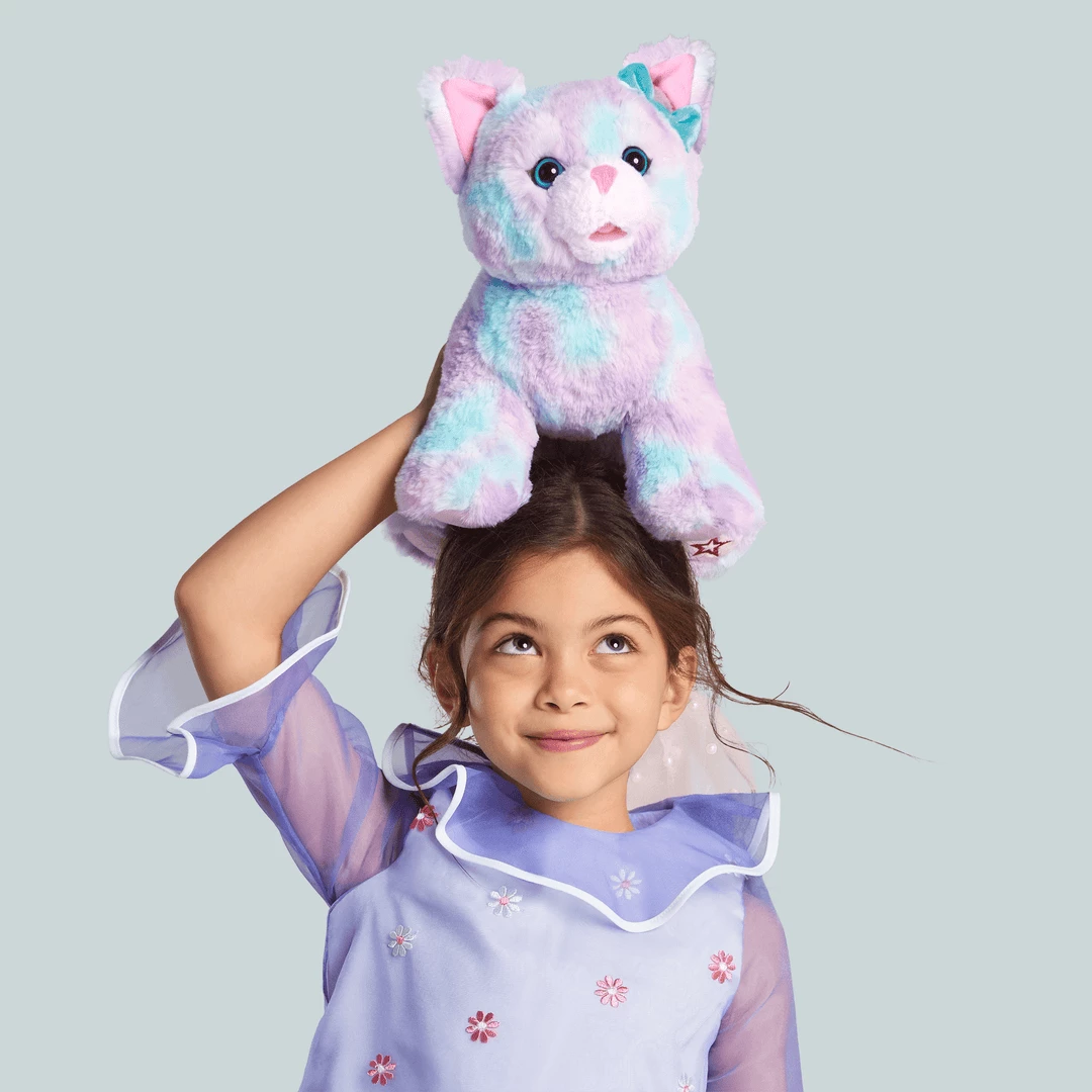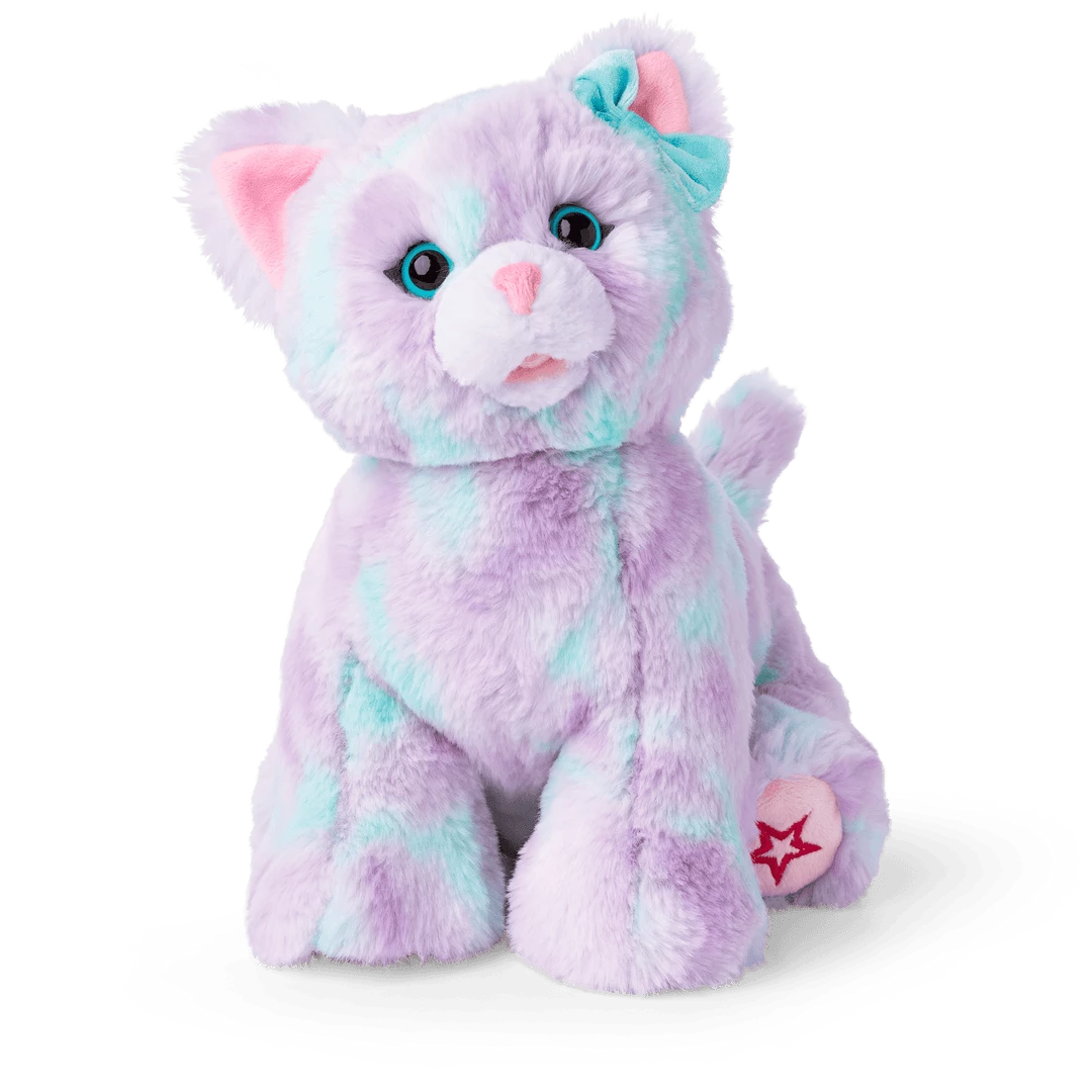 Purrpley Pink Kitty is as sweet as can be and loves finding ways to making people smile—like covering you in kitty kisses. She’s a girl-sized soft and cuddly cat plush with multicolor pastel fur and movable limbs so she can sit or lie down before pouncing. Girls will love her blue velvety ear bow, soft pink ears, open mouth with her tongue showing, and the embroidered American Girl® star on her back foot. Everyone will love that she’s made with more sustainable materials.