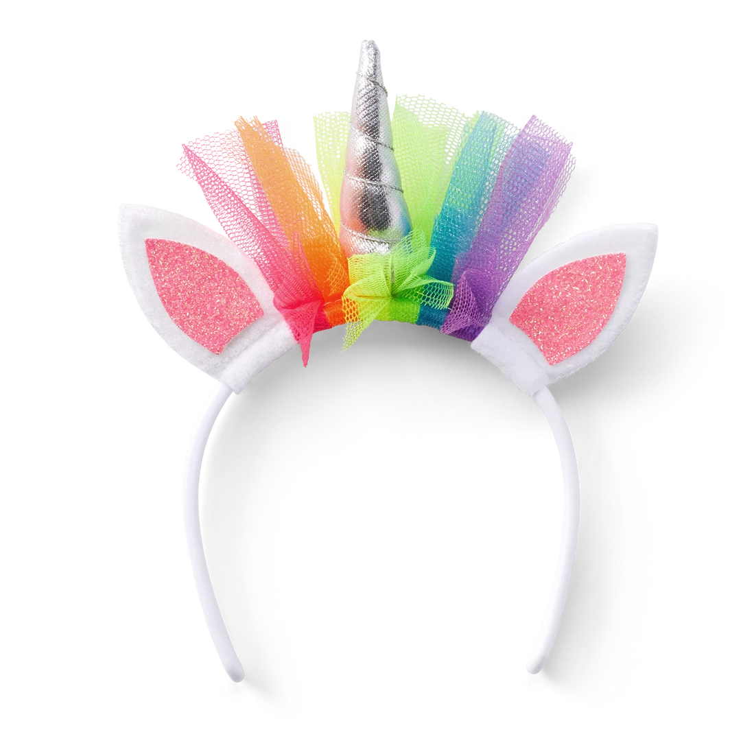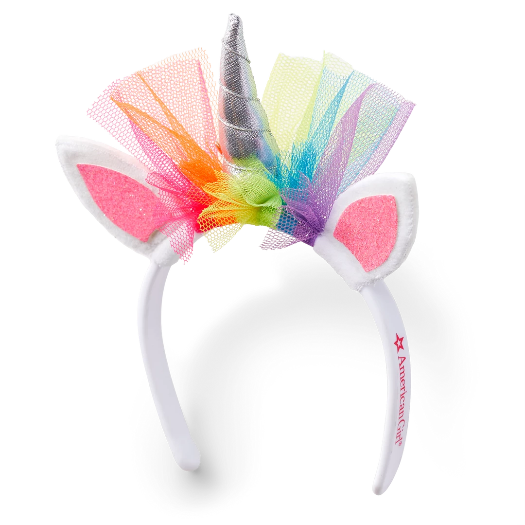 Dolls will get a truly unique look with this sparkly rainbow unicorn headband that matches the girl-sized headband. It has pink iridescent ears, a silver horn, and rainbow tulle.