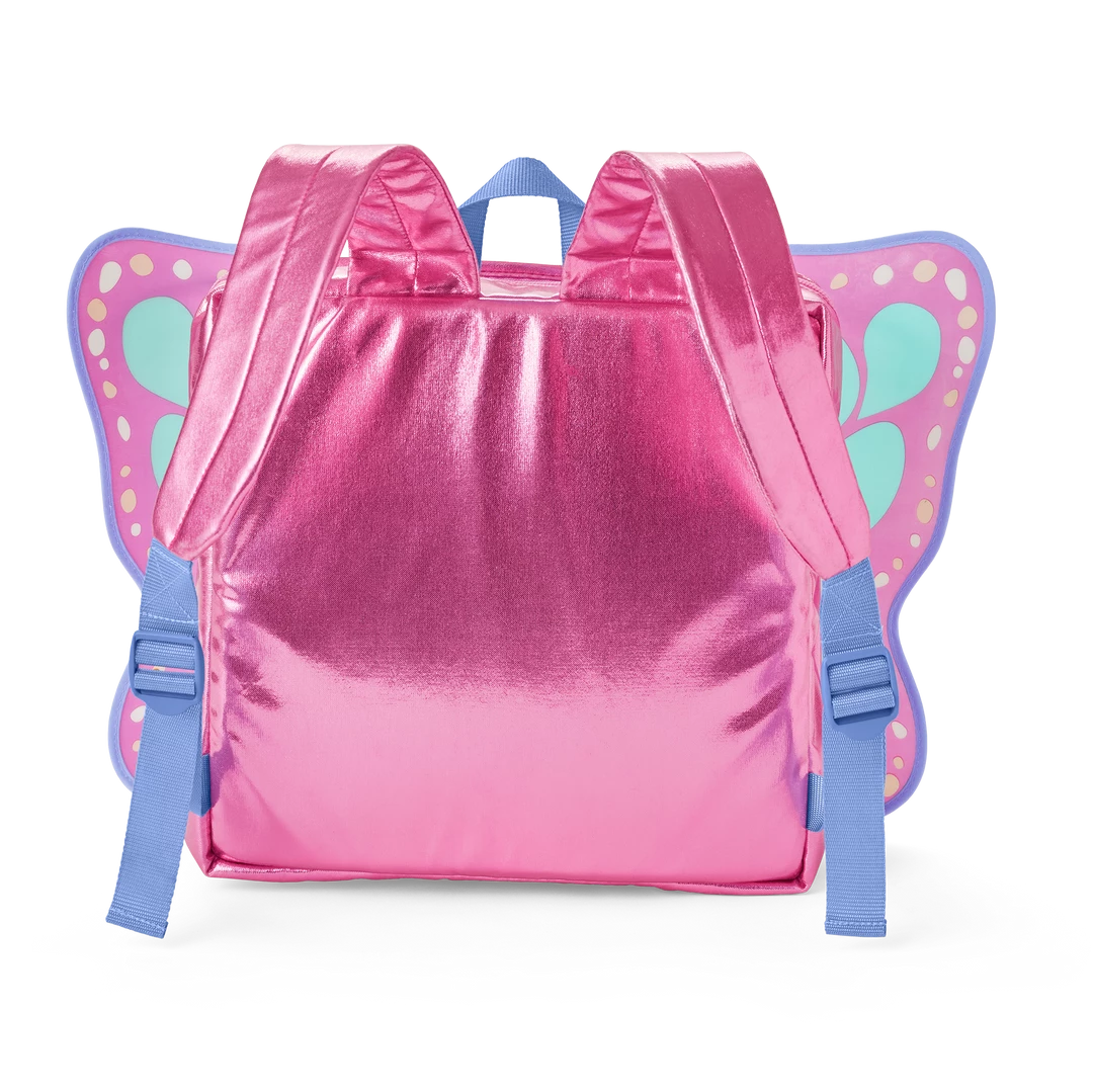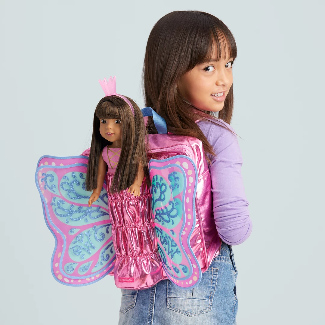 Pink Flutter Wings Doll Carrier for WellieWishers™ Dolls: A metallic backpack with a pocket that fits a WellieWishers doll, plus two layers of glittery butterfly wings. It has adjustable straps and a backpack compartment.