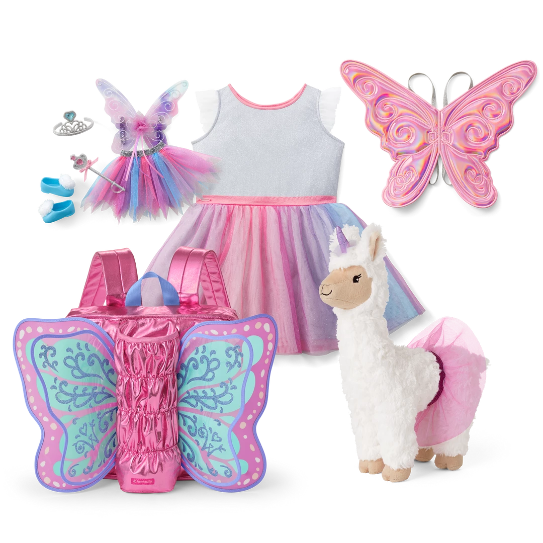 Your girl and her doll can welcome the warm days of spring in matching butterfly wings! This magical set—featuring a llamacorn, too!—includes: