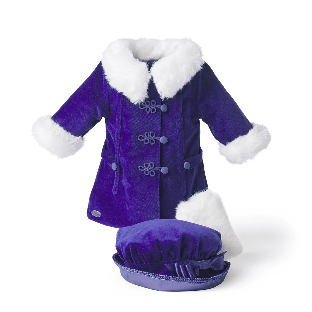 - A lined velveteen swing coat with faux-fur at the collar and cuffs, and fancy frog closures with purple buttons