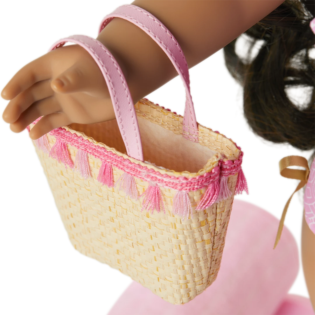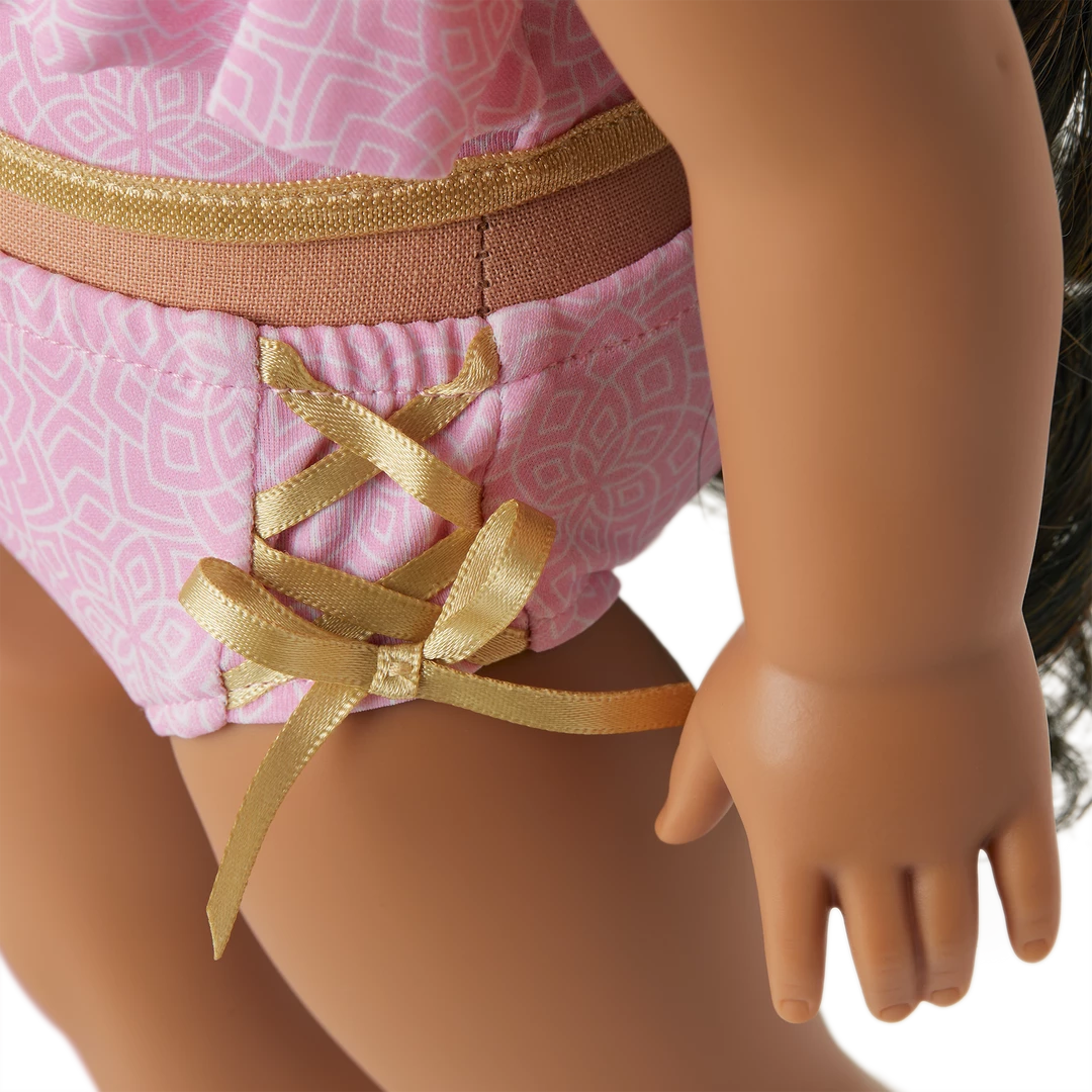- A matching pair of pink printed swim bottoms with gold lacing and ribbon at the sides