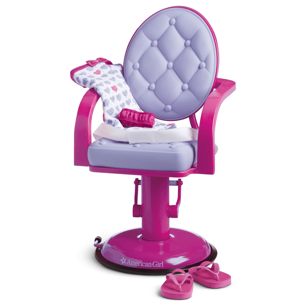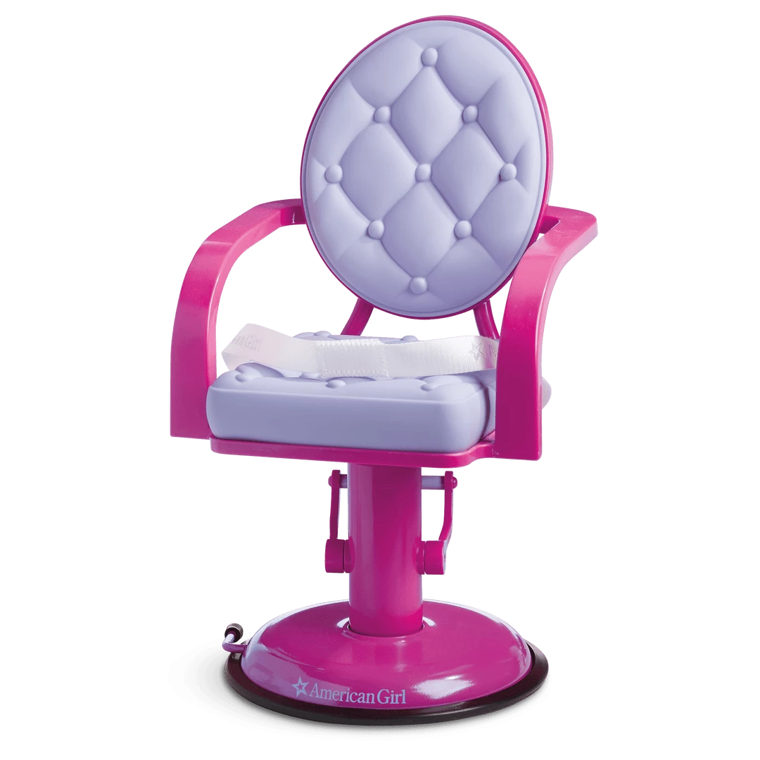 - A realistic salon chair that swivels and can be raised up and down with a working foot lever and features a metal base with a suction cup for stability