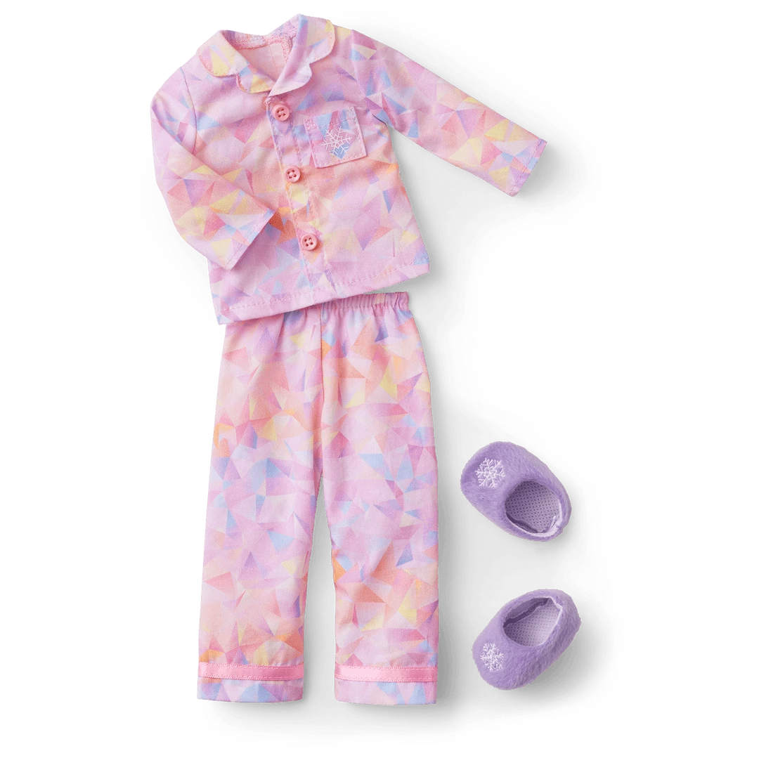 Gwynn’s™ Powder Pink Pajamas for 14.5-inch Dolls: A long-sleeved top and wide-leg pants with an allover graphic print, plus slippers with a snowflake embroidered on top.