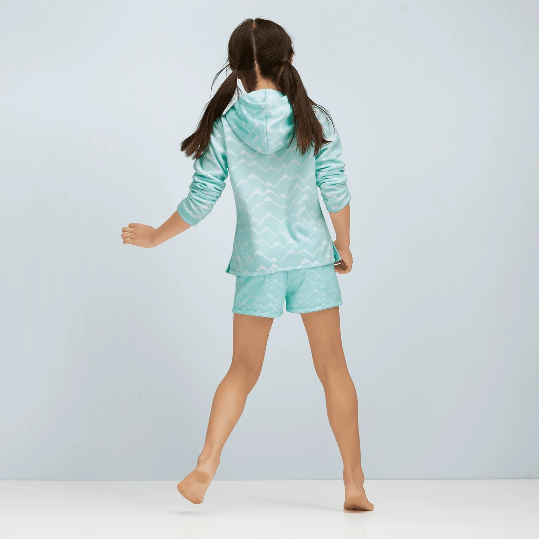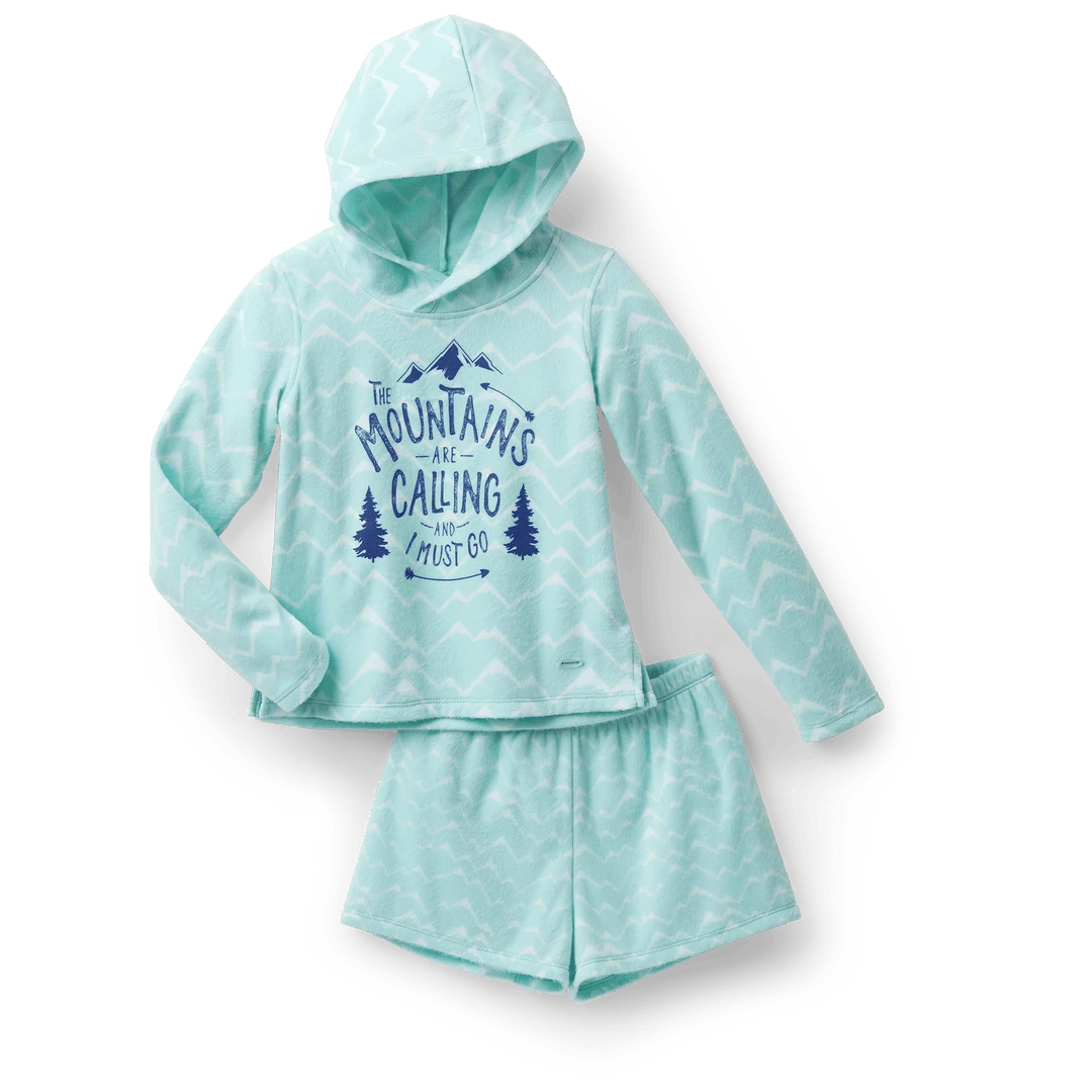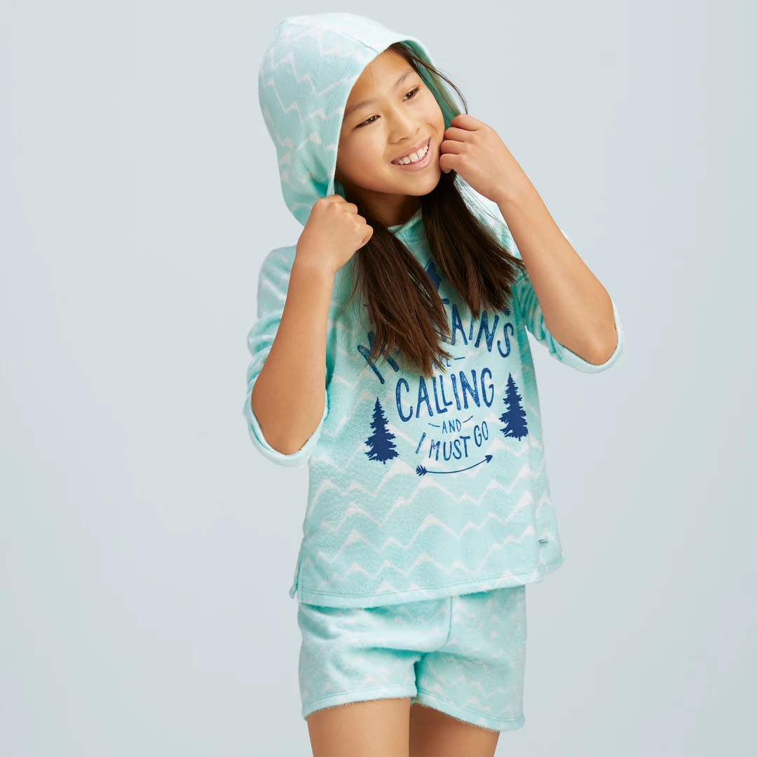 Corinne’s™ Powder Blue Pajamas for Girls: A fleece hooded sweatshirt with an allover mountain print and a graphic on the front, plus a pair of fuzzy fleece shorts that match the top. Flame-resistant polyester. Imported. Print. XS-XL