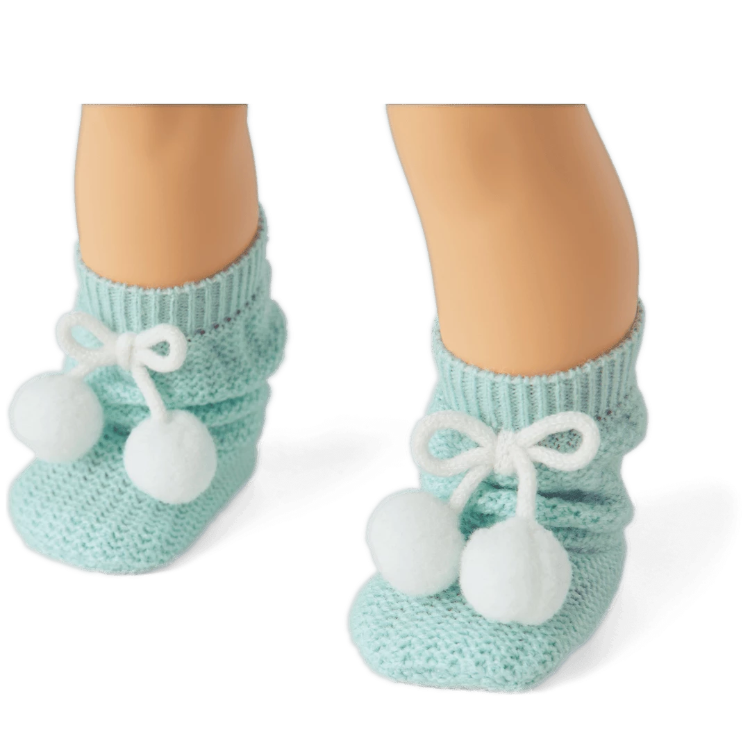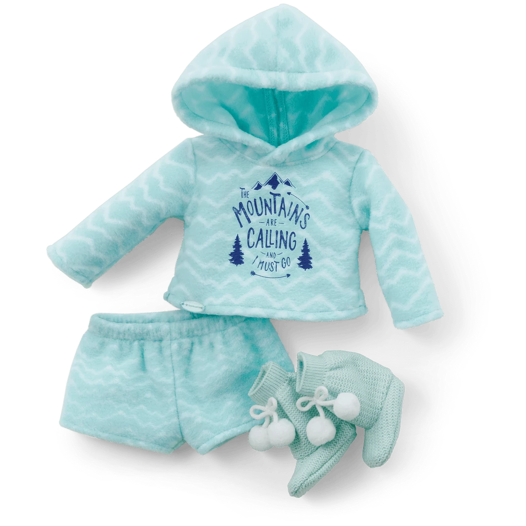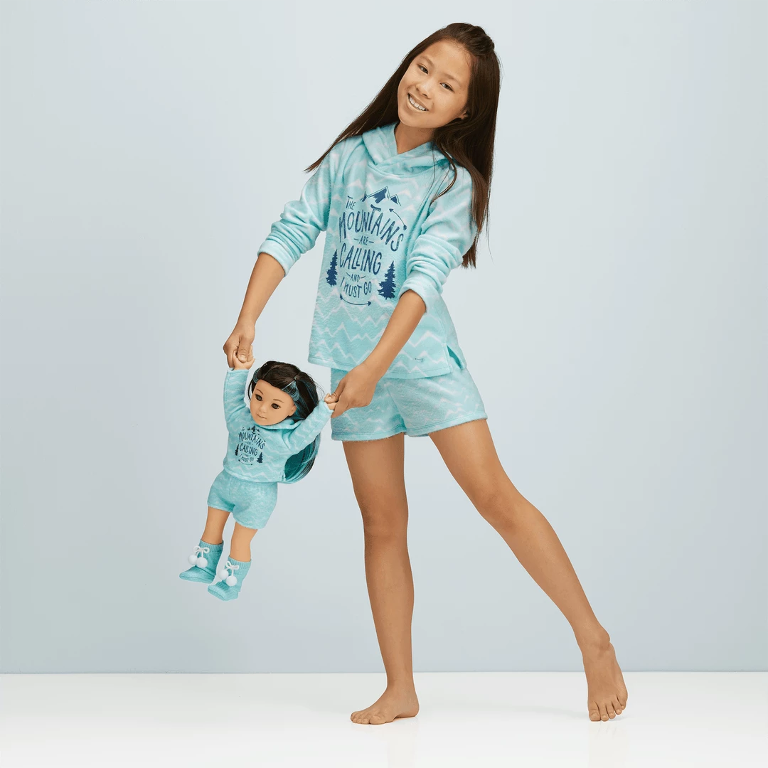 Corinne’s™ Powder Blue Pajamas for 18-inch Dolls: A fleece hooded sweatshirt, fuzzy fleece shorts, and knit slipper socks with pom-pom bows.