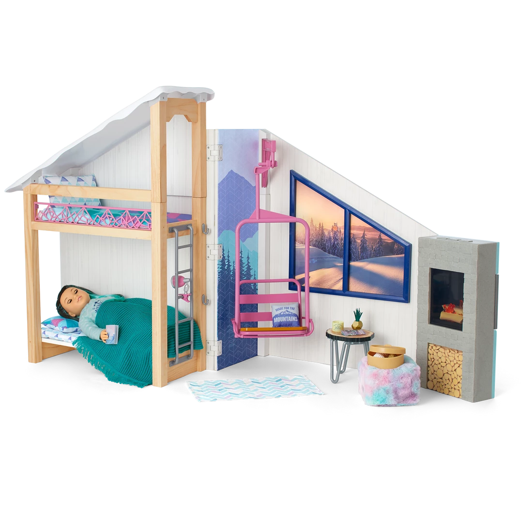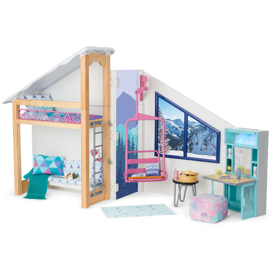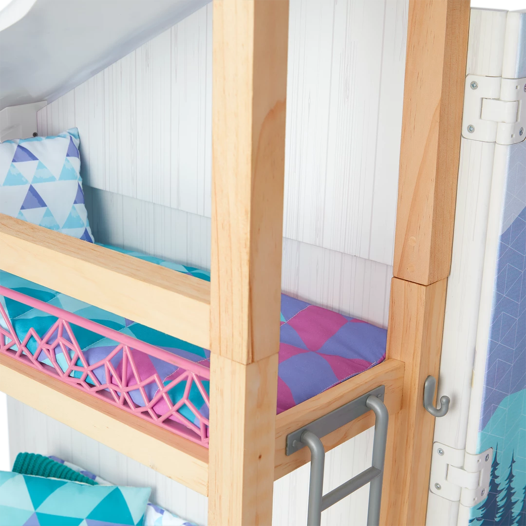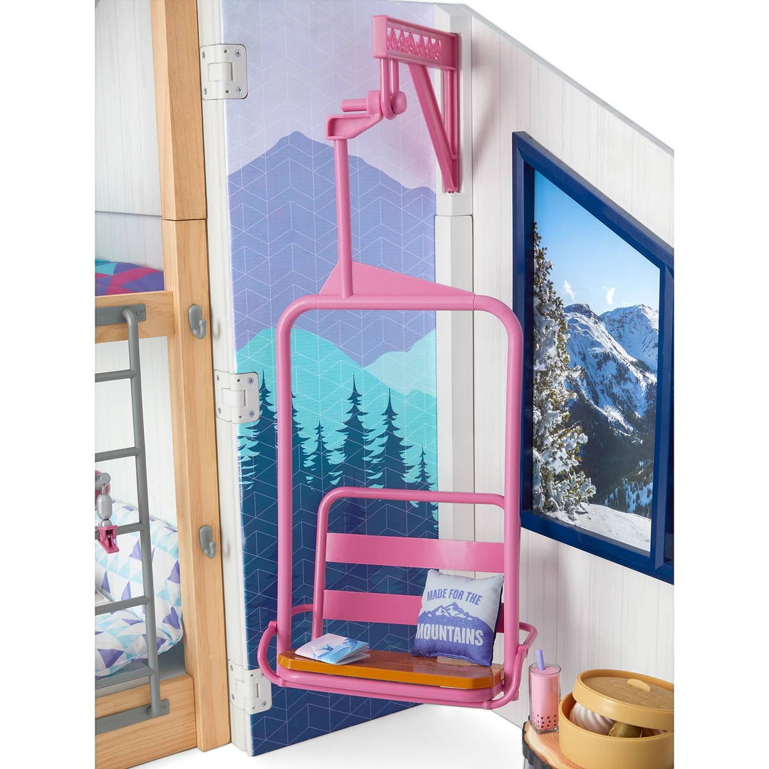 Corinne™ & Gwynn’s™ Bedroom Set: A bedroom structure that folds up for storage and folds out for play, featuring attached bunk beds with a lower bunk that converts to a sofa, plus mattresses, pillows, and blankets; a window with two scenes; a structure that can be used as a roof over the top bunk or placed on the ground as a ski hill; an upcycled lift chair; a ski rack; a two-sided entertainment center/vanity with a fireplace that lights up and plays songs and sounds; a table, chair, and rug; decor and room accessories; and pretend Chinese street food and boba tea.