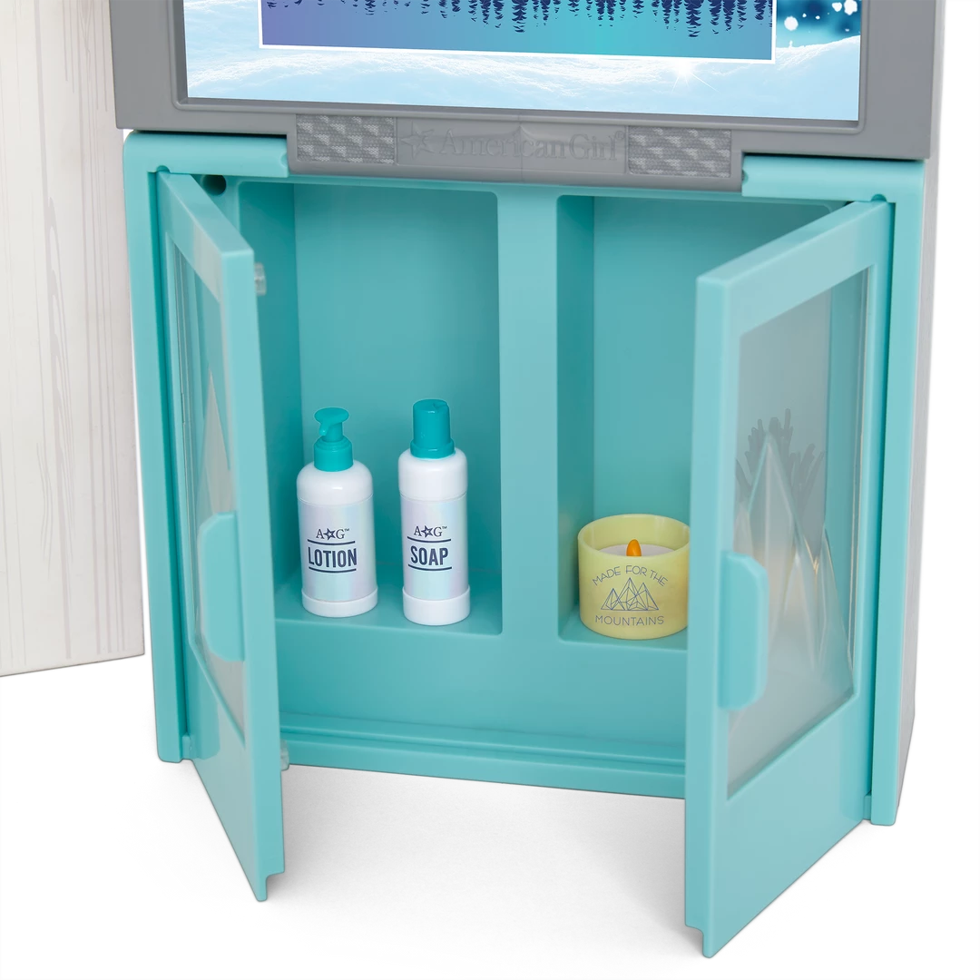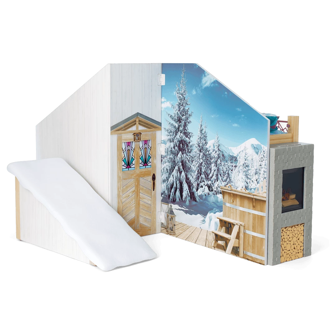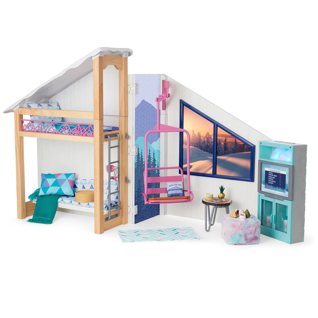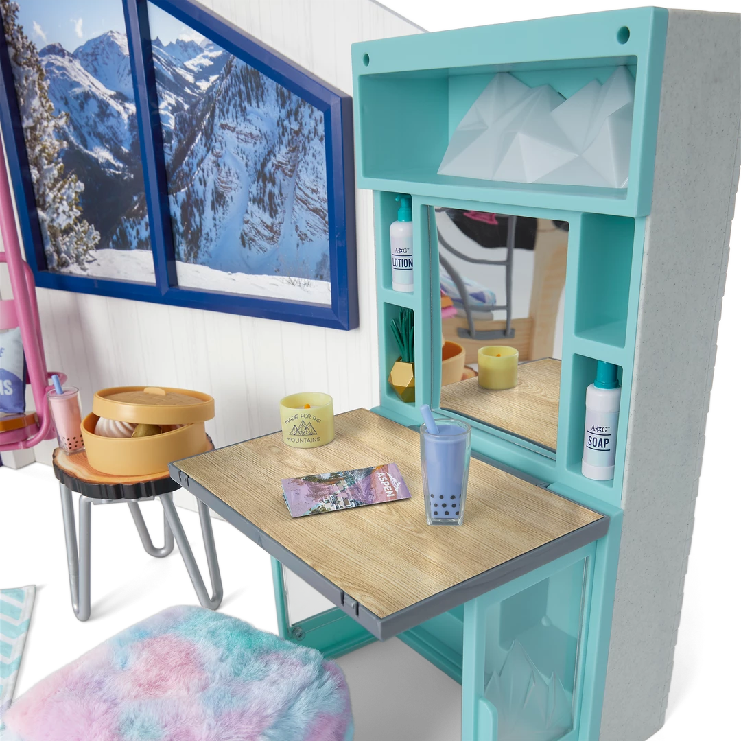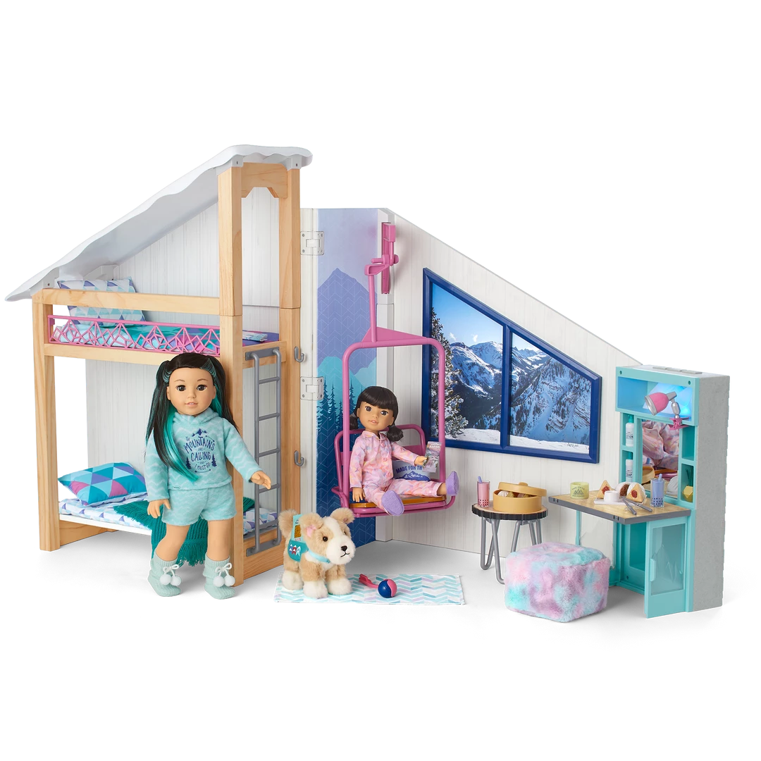 Corinne™ & Gwynn’s™ Bedroom Set: A bedroom structure that folds up for storage and folds out for play, featuring attached bunk beds with a lower bunk that converts to a sofa, plus mattresses, pillows, and blankets; a window with two scenes; a structure that can be used as a roof over the top bunk or placed on the ground as a ski hill; an upcycled lift chair; a ski rack; a two-sided entertainment center/vanity with a fireplace that lights up and plays songs and sounds; a table, chair, and rug; decor and room accessories; and pretend Chinese street food and boba tea.