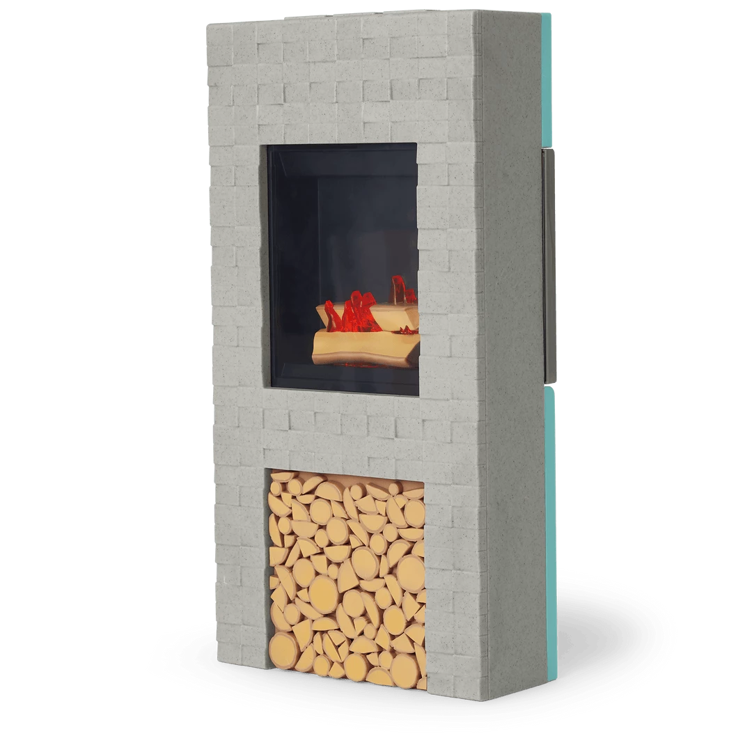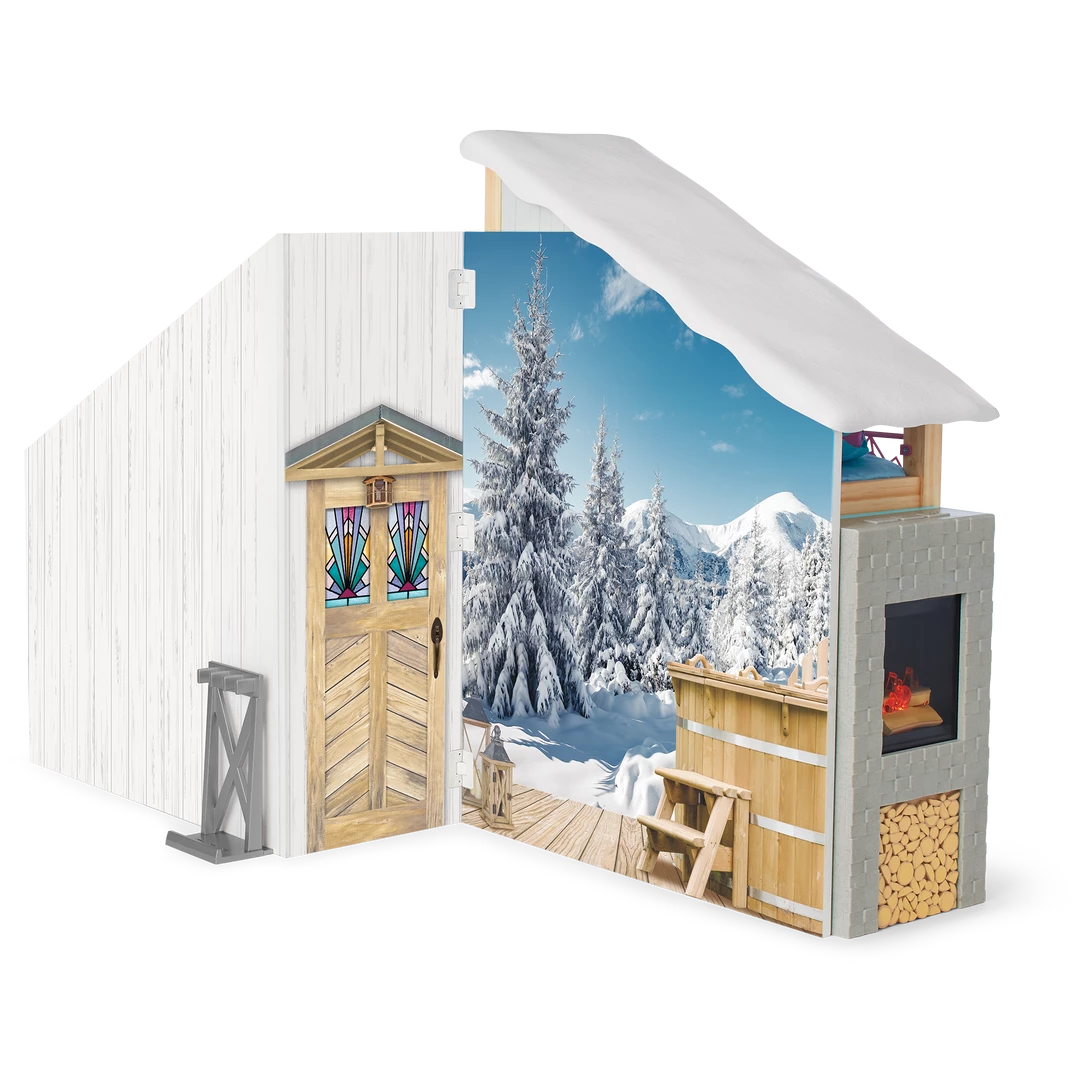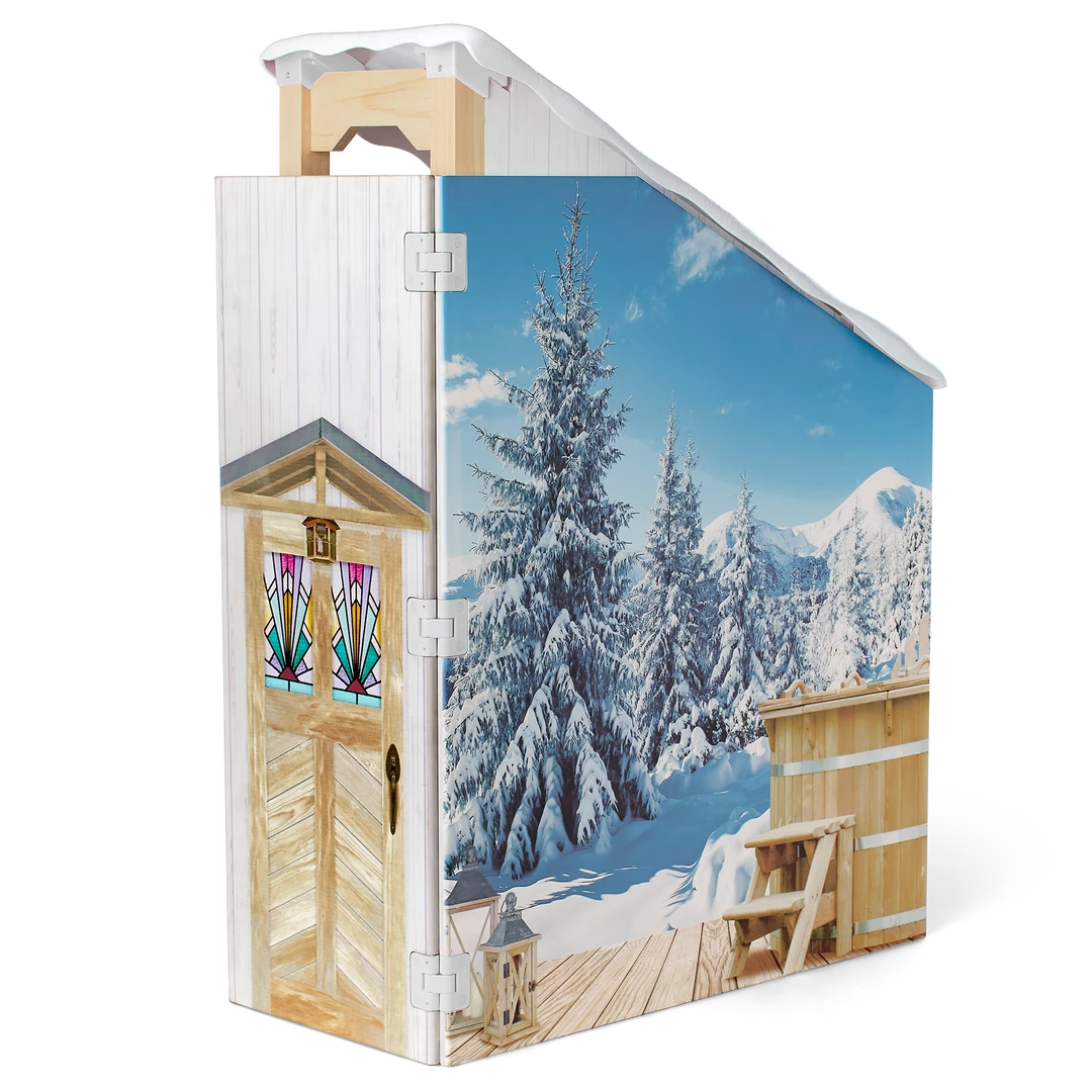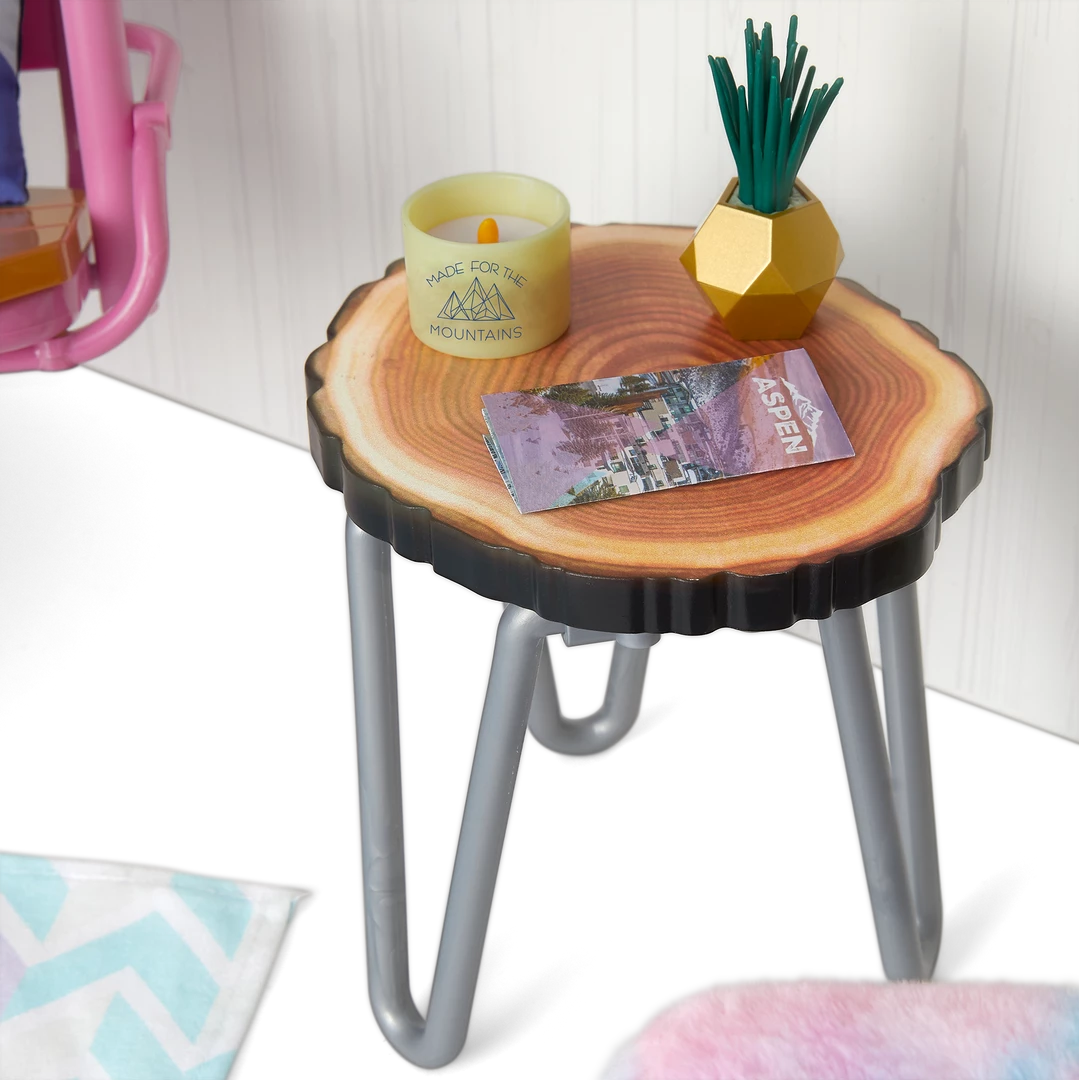 Corinne™ & Gwynn’s™ Bedroom Set: A bedroom structure that folds up for storage and folds out for play, featuring attached bunk beds with a lower bunk that converts to a sofa, plus mattresses, pillows, and blankets; a window with two scenes; a structure that can be used as a roof over the top bunk or placed on the ground as a ski hill; an upcycled lift chair; a ski rack; a two-sided entertainment center/vanity with a fireplace that lights up and plays songs and sounds; a table, chair, and rug; decor and room accessories; and pretend Chinese street food and boba tea.