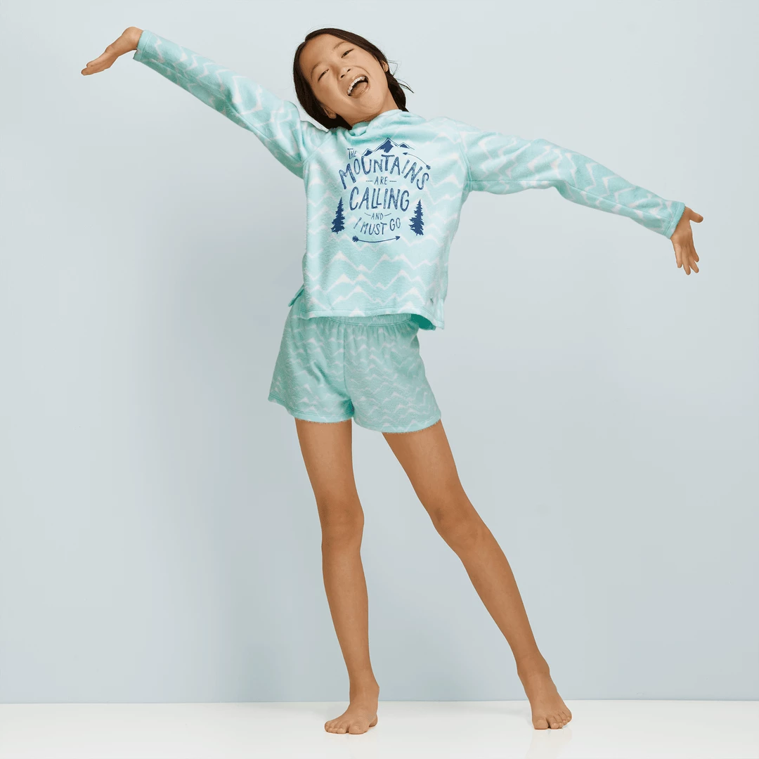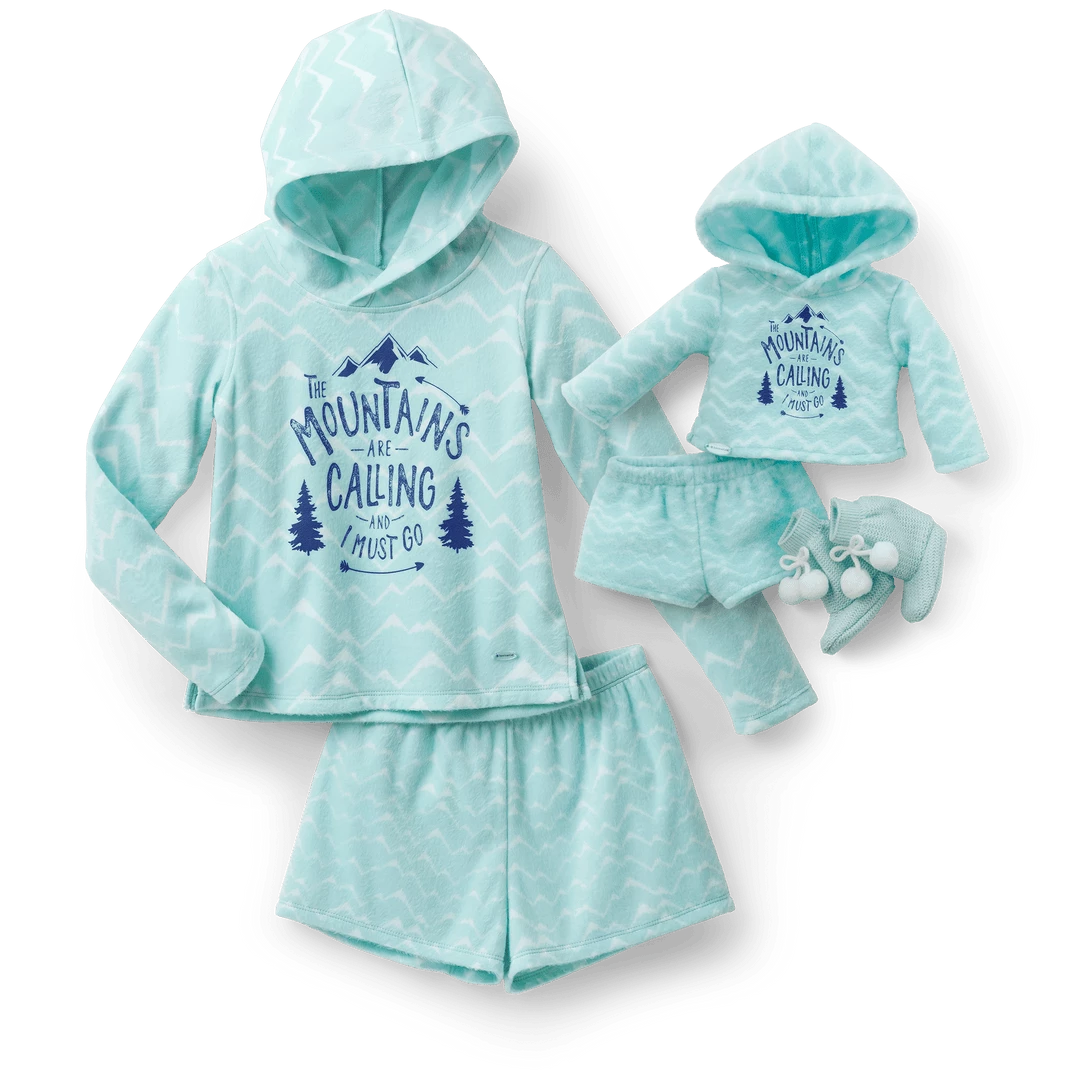 Corinne’s™ Powder Blue Pajamas for Girls: Just like the doll version! This snuggly PJ set includes a fuzzy, light blue fleece hooded sweatshirt with an allover mountain print and a “Mountains are Calling” graphic on the front, plus a pair of fuzzy fleece shorts that match the top. Polyester. Imported. Print. XS-XL.