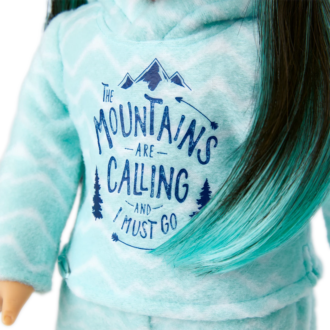 Corinne’s™ Powder Blue Pajamas for 18-inch Dolls: In their new decorator-designed purple bedroom, Corinne snuggles up with Flurry in front of the fireplace wearing this cozy PJ set that includes a fuzzy, light blue fleece hooded sweatshirt with an allover mountain print and a “Mountains are Calling” graphic and a pair of fuzzy fleece shorts with an allover mountain graphic that matches the top. Also includes a pair of knit slipper socks that have a bow with pom-poms