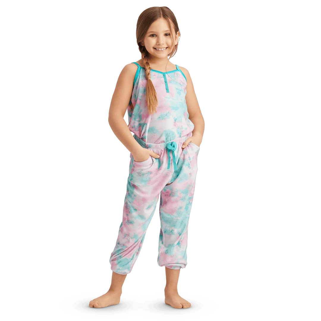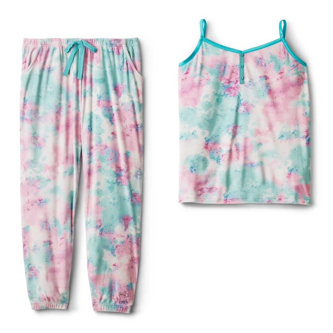 Dream, sleep, scheme, and keep comfy at night in this tie-dyed velour tank top and a pair of tie-dyed velour jogger pants with an elastic waistband and cuffs, plus two front pockets. Polyester/spandex. Imported. Print. XS-XL