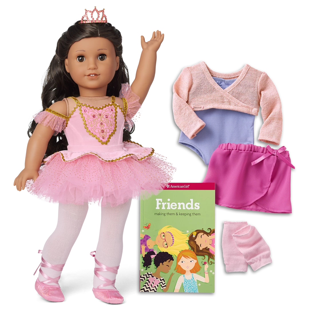 The perfect friend for girls who love to dance and twirl, this 18″ Truly Me doll has curly dark-brown hair, brown eyes, and medium skin, and arrives dressed in a sparkly leotard with golden edging, a ruffly tutu, underwear, tights, and ballet shoes with crisscross ribbons. Also includes a pretty pink tiara, wrap skirt, warm-up leotard, sparkly sweater, and legwarmers, plus the Friends: Making Them & Keeping Them book.