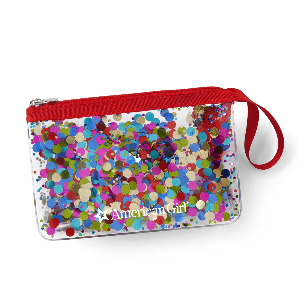 Confetti Wristlet for Girls: A cute wristlet that features colorful confetti against a clear background, a zipper, and a loop to carry it around her wrist.