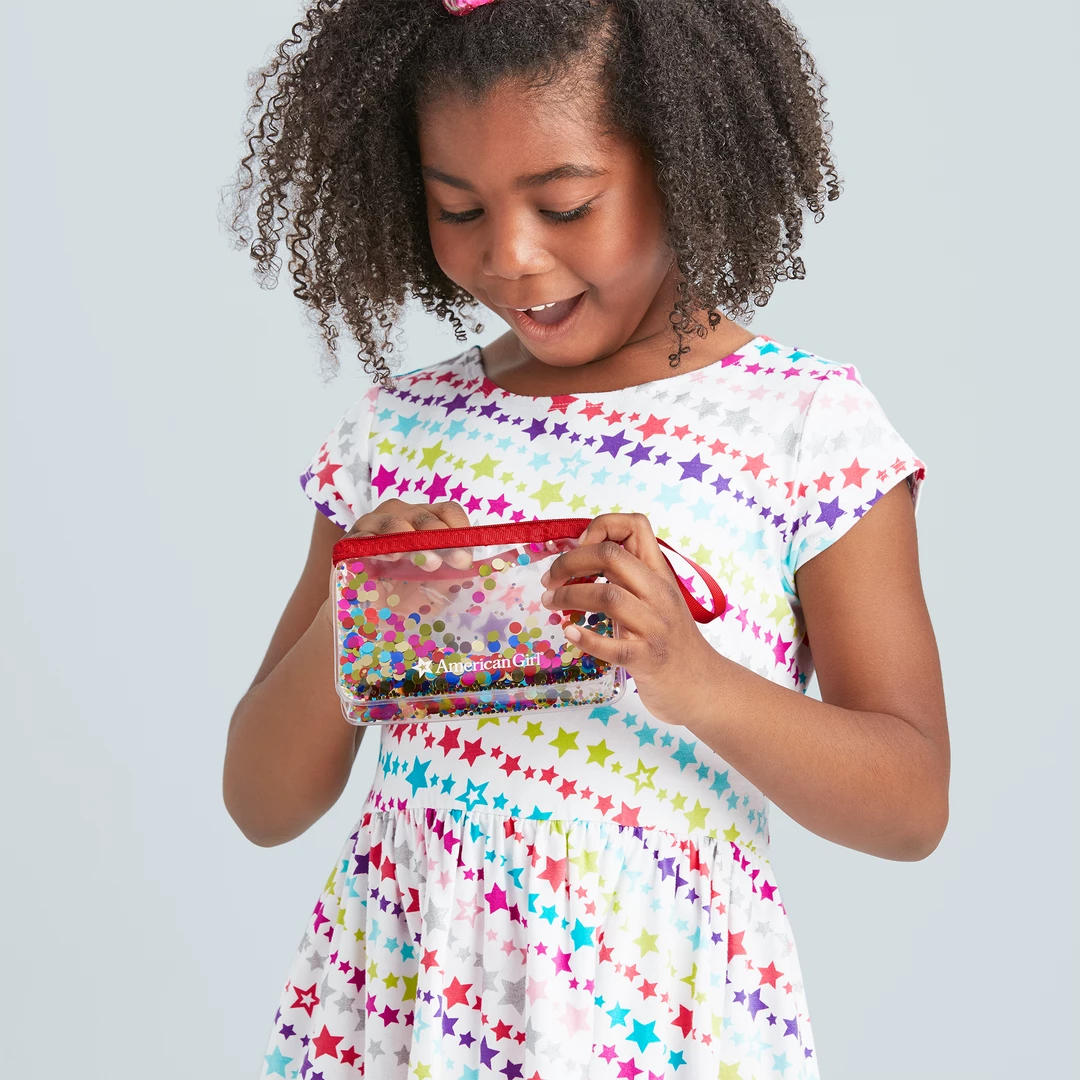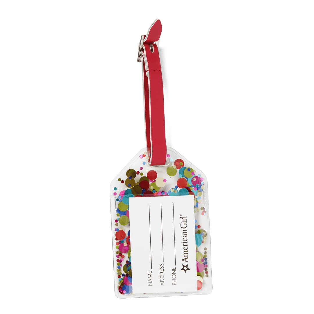 Confetti Luggage Tag for Girls: This clear luggage tag features colorful confetti and an American Girl star, a place to write her contact details, and a buckled red strap to attach the tag to her suitcase.