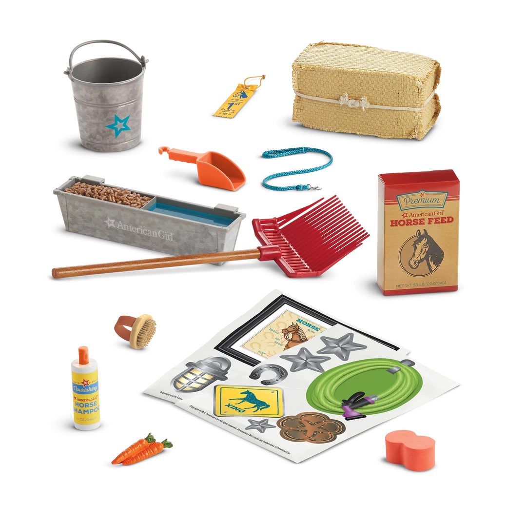 - Stable supplies: A red rake, a pretend hay bale; a clump of pretend carrots; a horse lead that clips onto the bridle; a bucket and a sponge for washing her horse; a bottle of pretend horse shampoo; a horse brush.