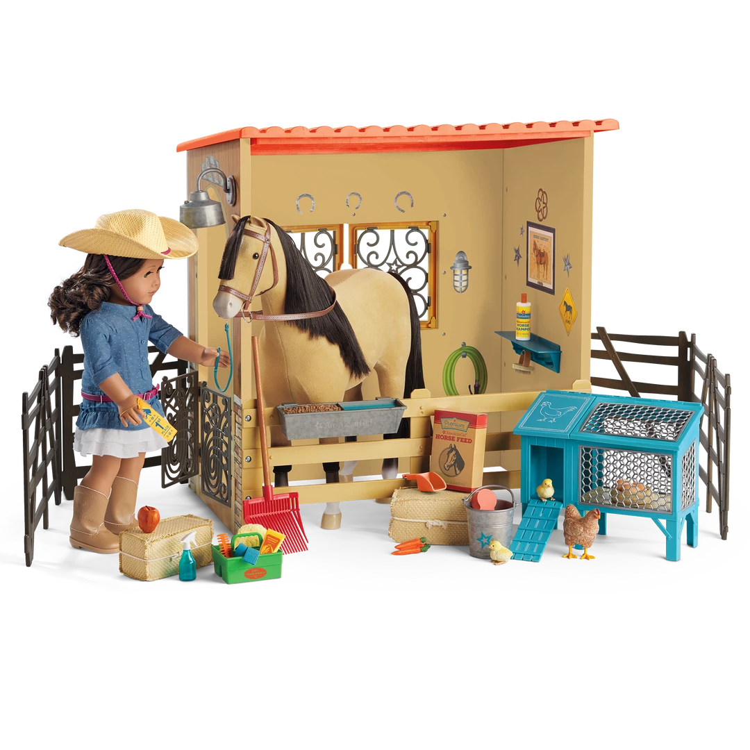 - Fencing and food: Four repositionable fence pieces that snap together; a feeding trough that attaches to any fence piece; a box of pretend horse food and a scooper; and two sticker sheets to decorate the stable.
