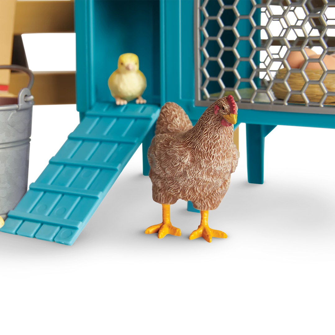 - More to adore: An award ribbon; a friendly chicken and two cute chicks; a chicken coop with a ramp; and a nest that holds three pretend brown eggs.