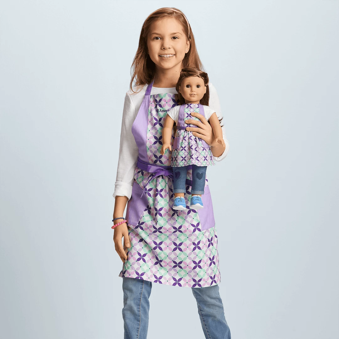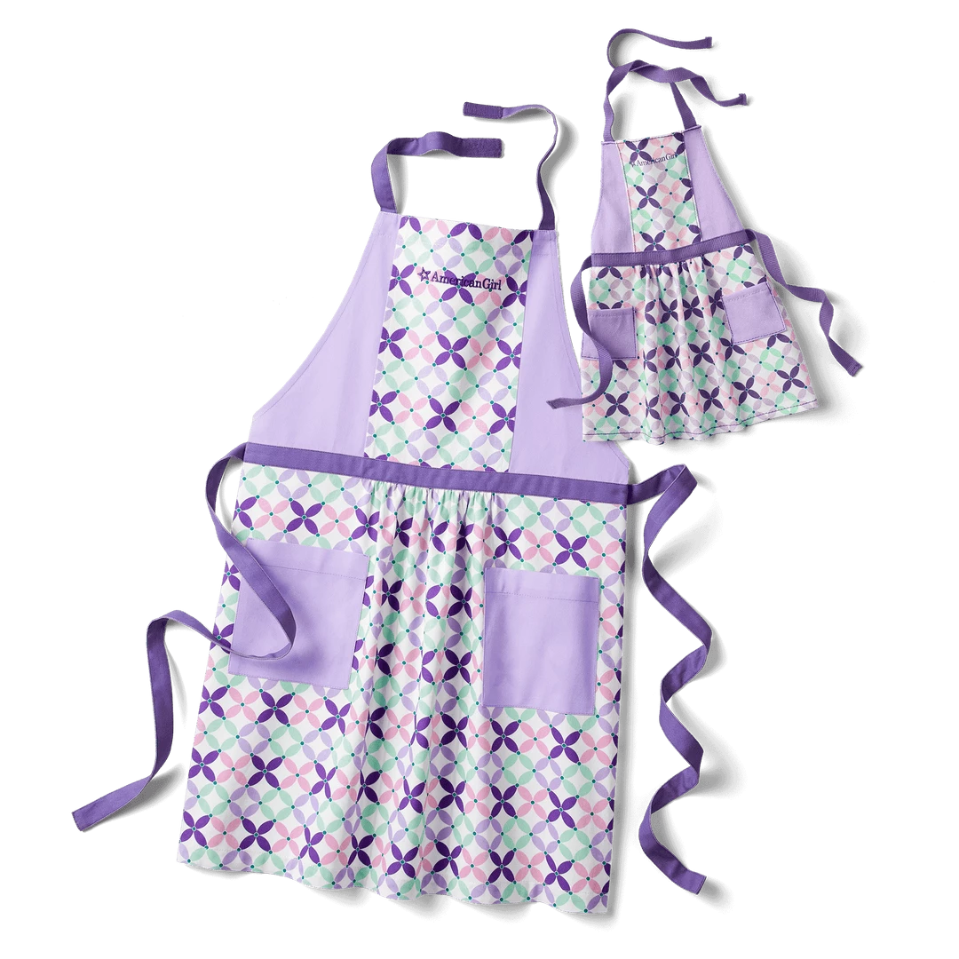 Dolls and girls will be able to cook up a storm in the kitchen with these matching twill print aprons. The aprons gather in the front and have purple ties at the neck and waist. Girls’ apron: Cotton. Imported. Print. One size.