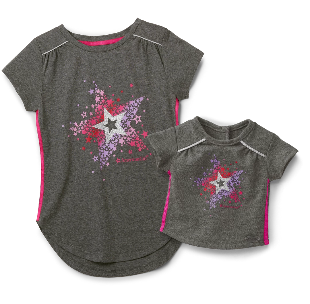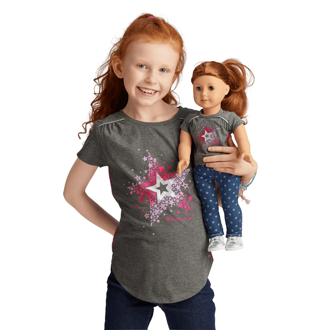 Girls and their dolls can match in sporty, starry tees! They have bright-pink side stripes and an inner star design, plus the American Girl logo. Girls’ tee: Imported. Gray. Sizes XS-L