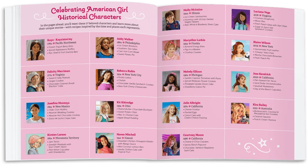 Featuring more than 50 recipes, this cookbook blends the beloved stories of 17 American Girl® characters with easy-to-make items that teach essential kitchen skills. Young chefs can master measuring, rolling, and decorating while making an array of sweet treats as well as savory snacks like hummus with veggie dippers. Recipes like Josefina’s™ Mexican Hot Chocolate Cookies, Rebecca’s™ Potato Latkes, and Luciana’s™ Cosmos Doughnuts Pies will engage kid chefs of all skill levels. Colorful pictures of the dishes and characters are sprinkled throughout the pages; the mix of history and contemporary flair will make this a cookbook to treasure. Hardcover. 144 pages.