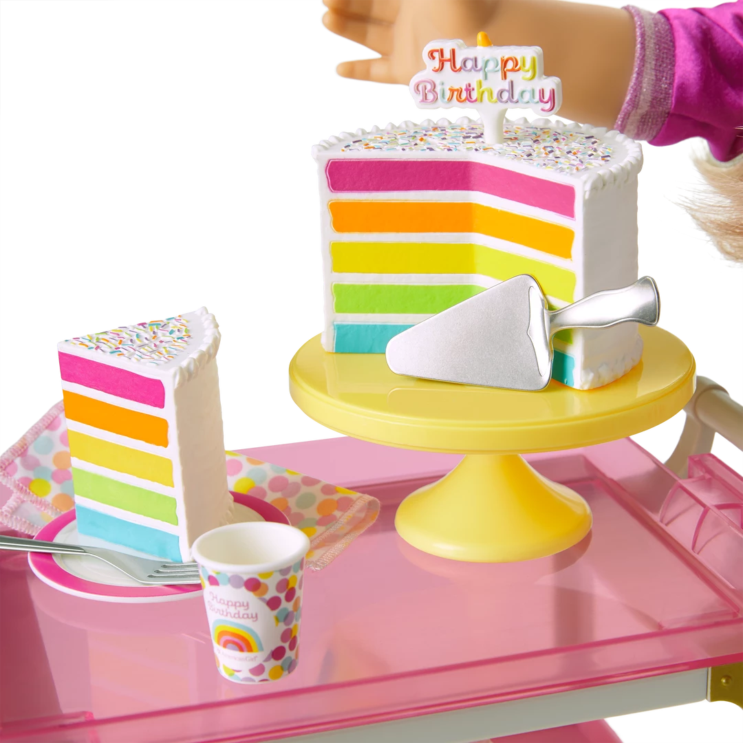 - A musical rainbow cake with faux frosting decorations and sprinkles that plays “Happy Birthday” when you press the candle on top