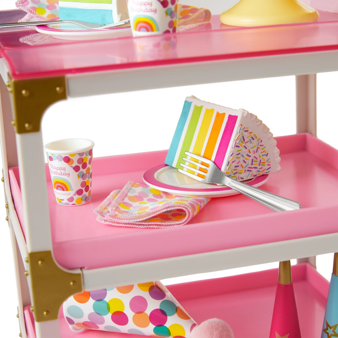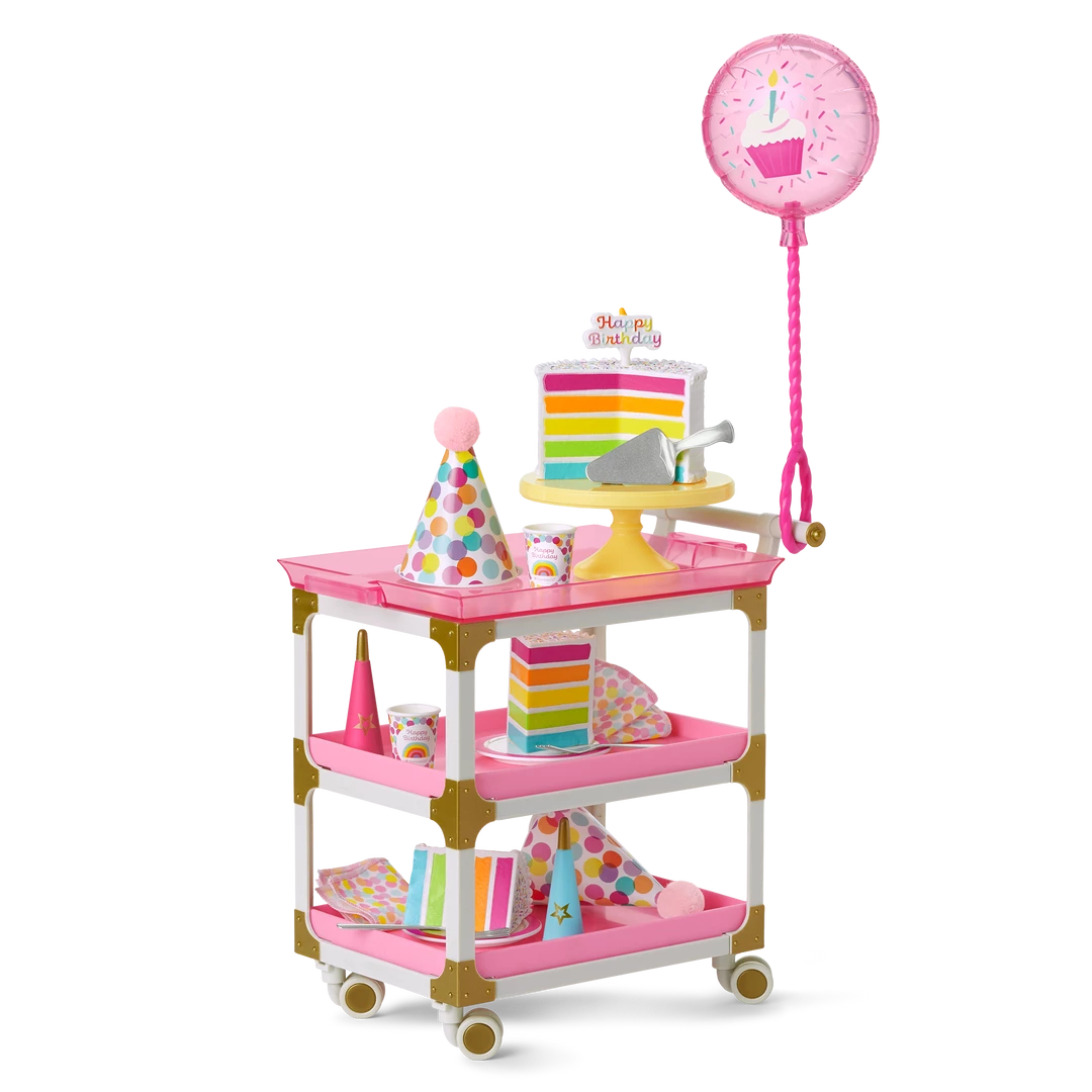 - A rolling cart with a handle, a removable pink tray top, and two shelves to hold all of the birthday party supplies