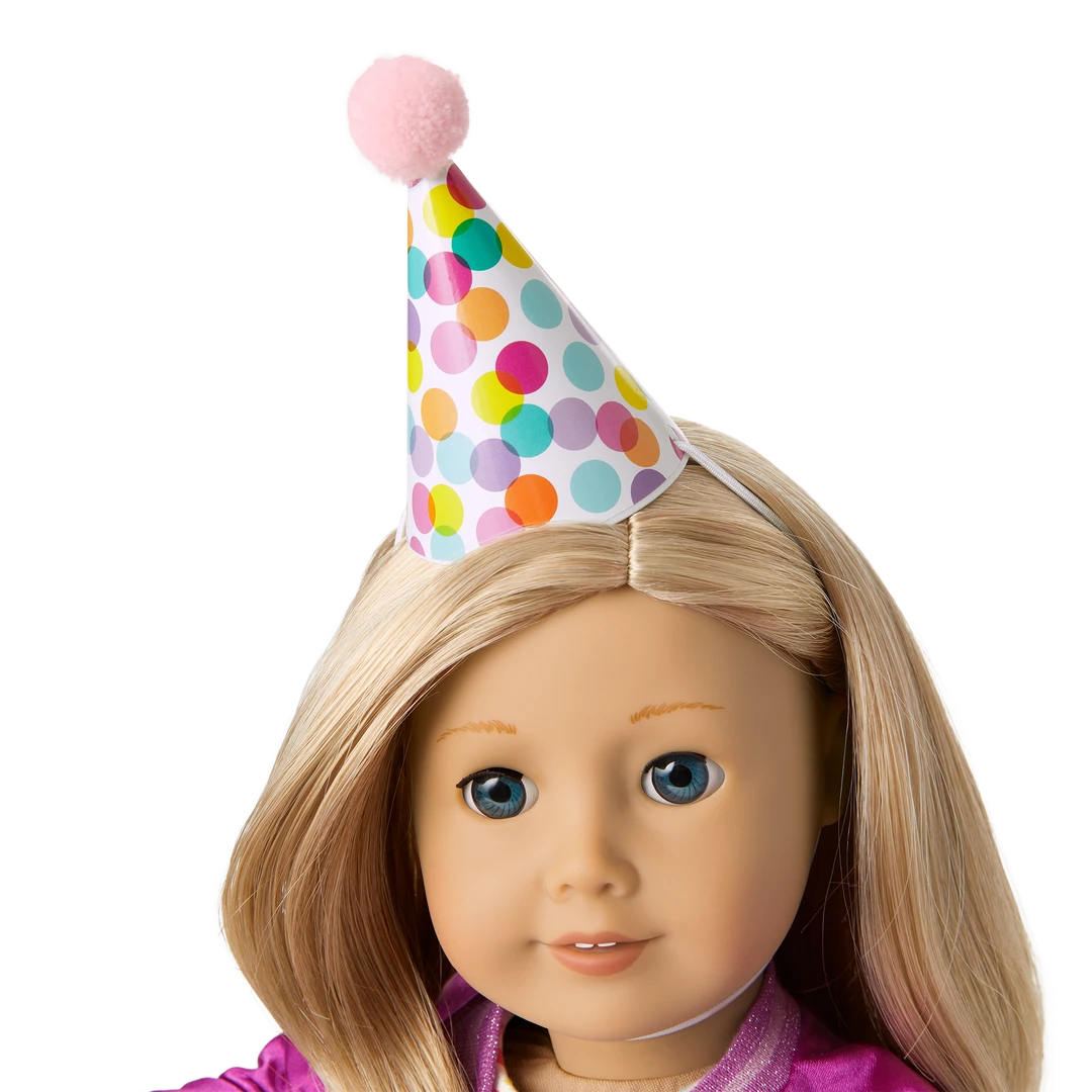 - A pink translucent balloon with a birthday cupcake graphic and a handle for dolls to hold