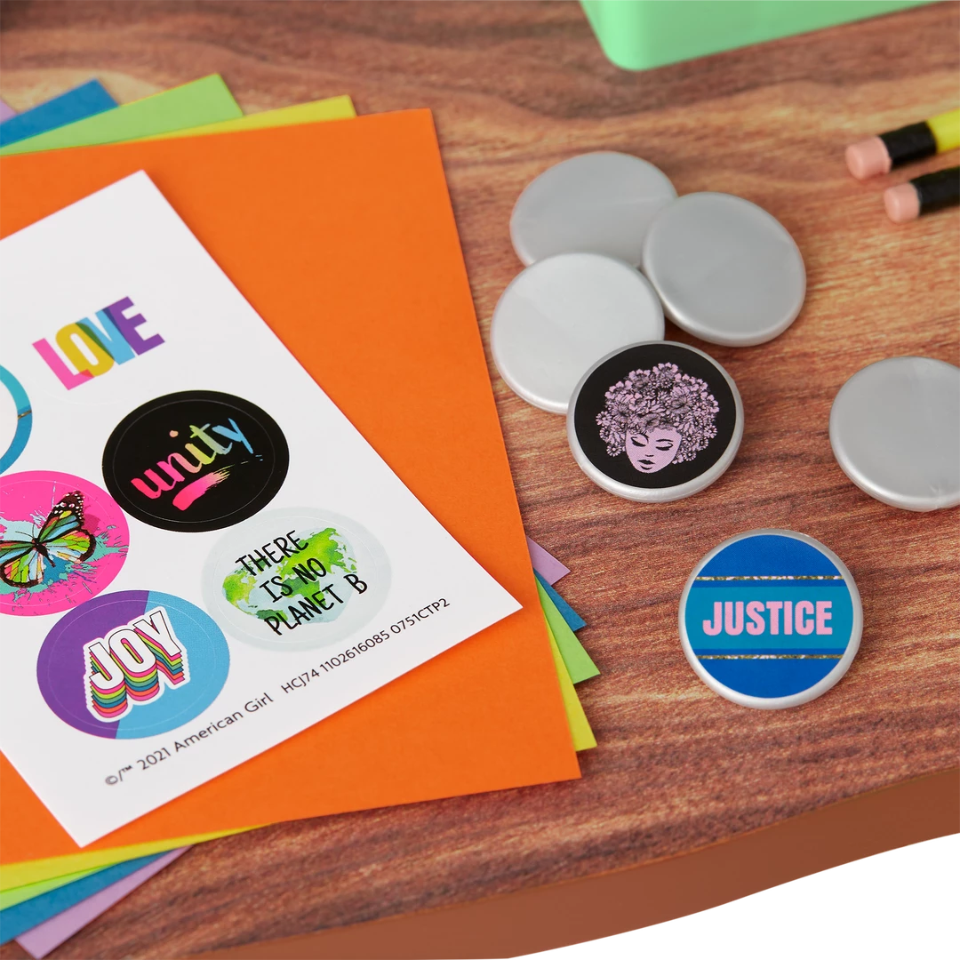 Makena, Evette, and Maritza can gather after school to brainstorm, make plans, and craft buttons and signs for the causes they care about. This set features: