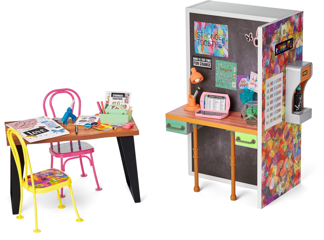 The Community Center Table & Chairs Set: A table, a yellow metal chair, a pink metal chair, a supply holder, plenty of pretend art supplies, buttons with clips on the back to attach them to the dolls’ clothes or bags, and stickers that attach to the button tops to spread awareness about the girls’ causes