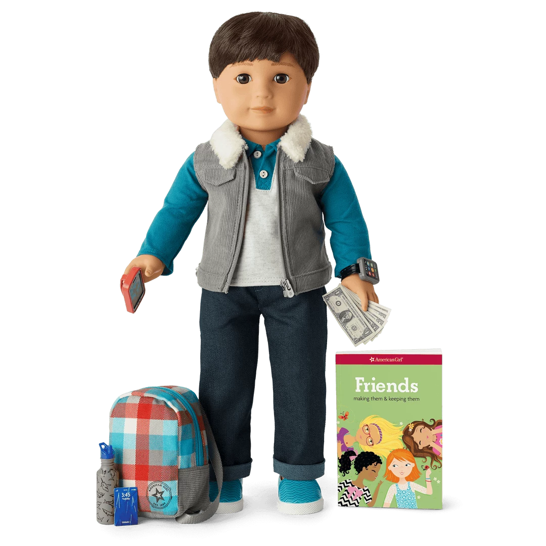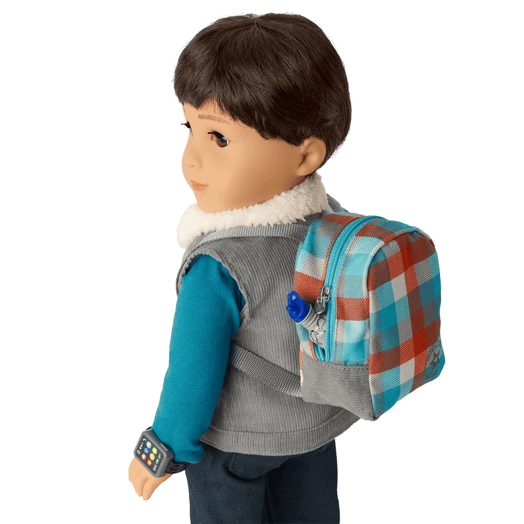 - A plaid backpack with an AG graphic that zips open and fits on the doll’s shoulders