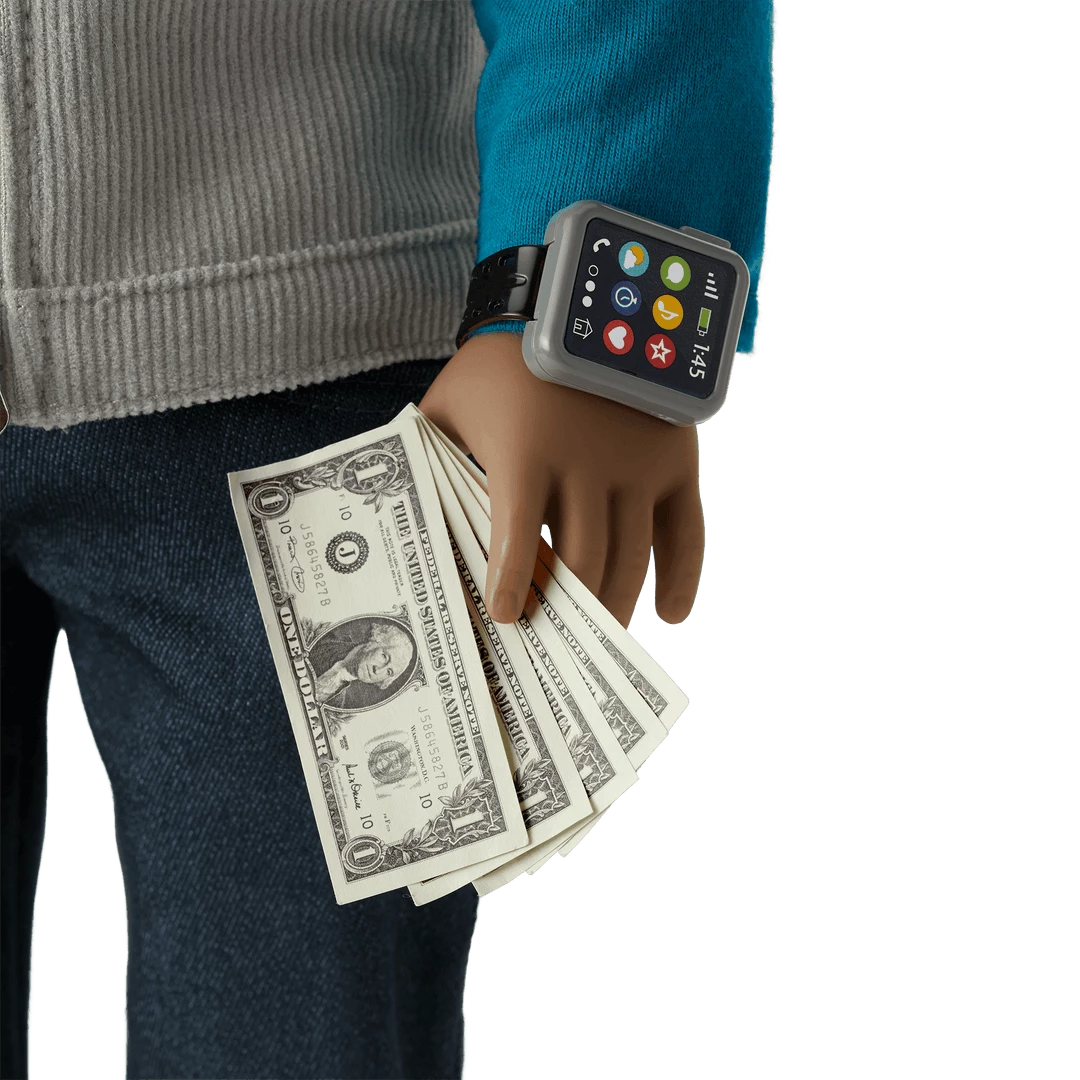 - A plaid backpack with an AG graphic that zips open and fits on the doll’s shoulders