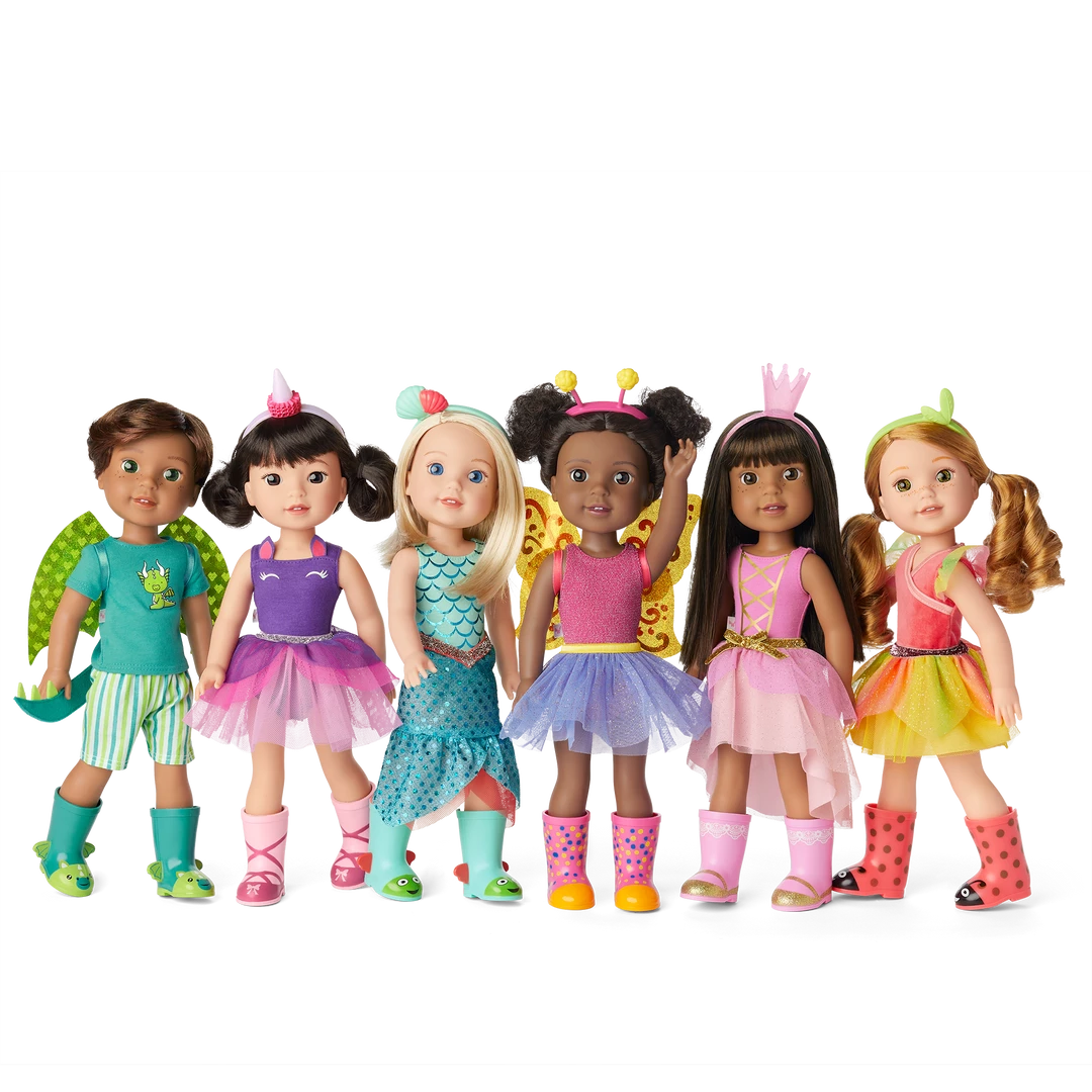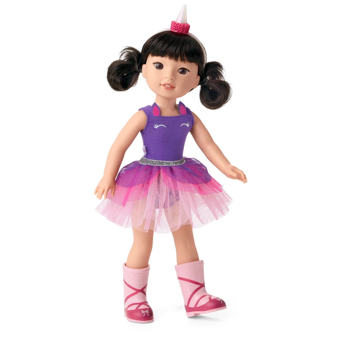 Emerson™ Doll: The 14.5″ Emerson doll, featuring dark-brown eyes and curly pigtails, dressed in her unicorn outfit and wellie boots