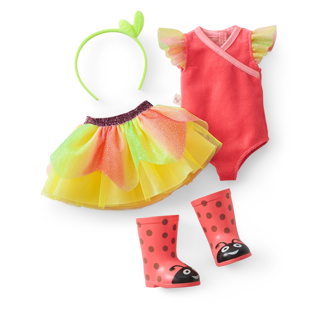 Willa™ Doll: The 14.5″ Willa doll, featuring hazel eyes and long strawberry-blond hair, dressed in her nature-fairy outfit and wellie boots