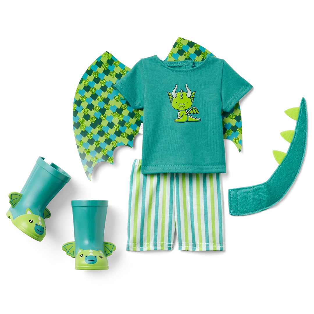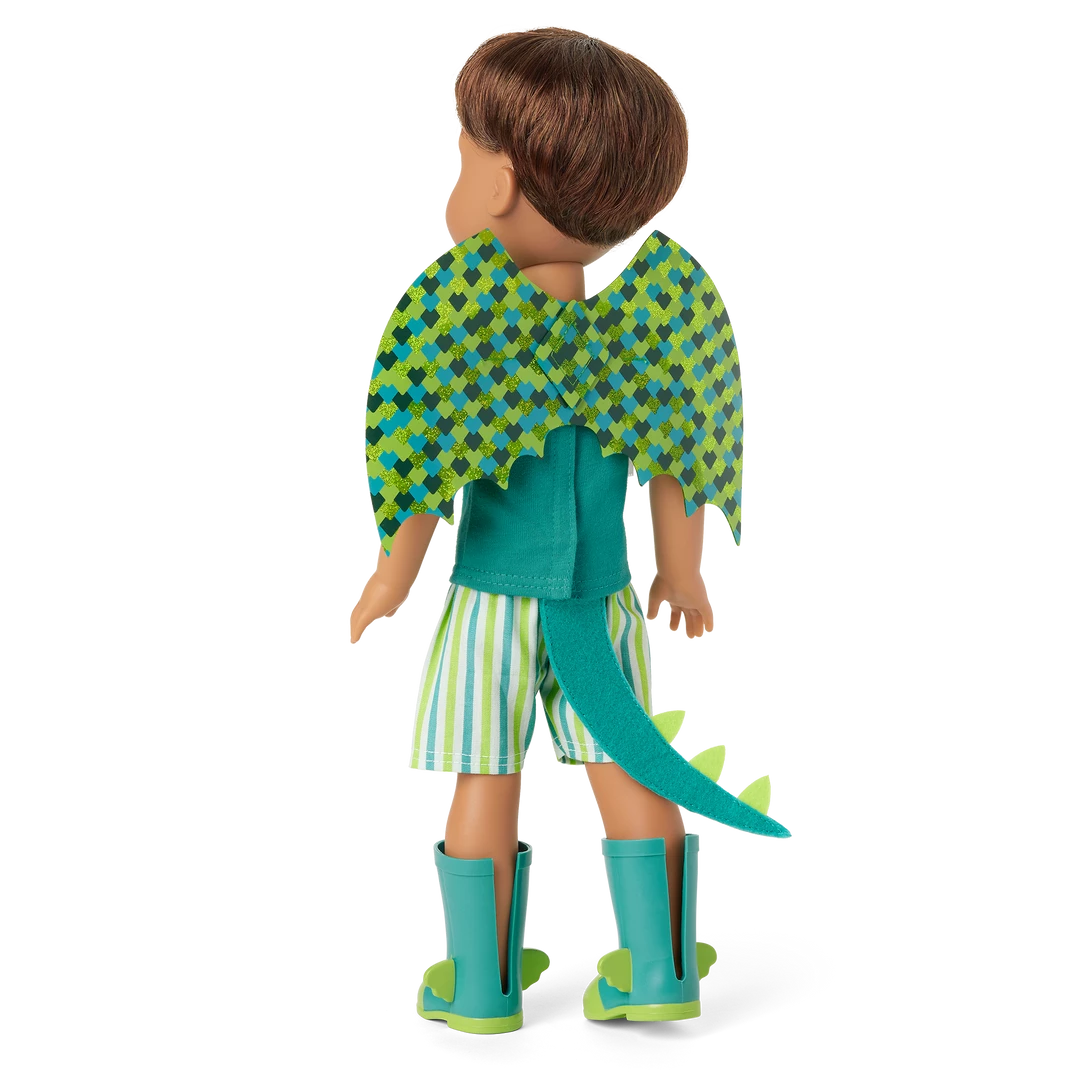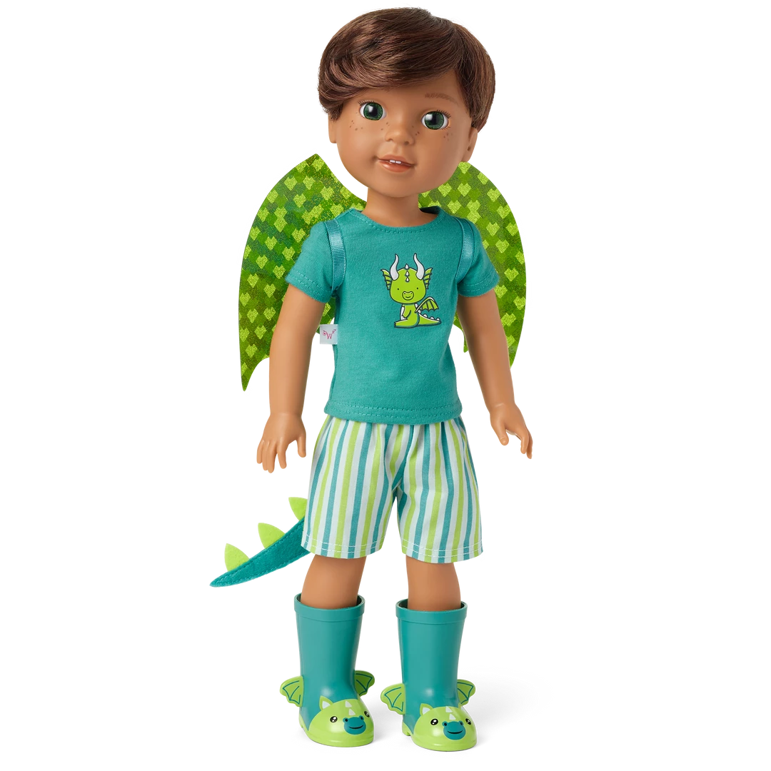Bryant™ Doll: The 14.5” Bryant doll, featuring green eyes and brown hair, dressed in his dragon outfit and wellie boots