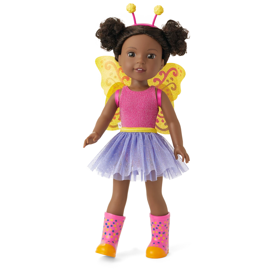 Kendall™ Doll: The 14.5″ Kendall doll, featuring deep-brown eyes and curly black hair in pigtails, dressed in her butterfly outfit and wellie boots
