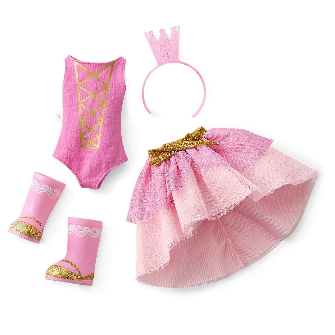 Ashlyn™ Doll: The 14.5″ Ashlyn doll, featuring brown eyes and silky brown hair, dressed in her princess outfit and wellie boots
