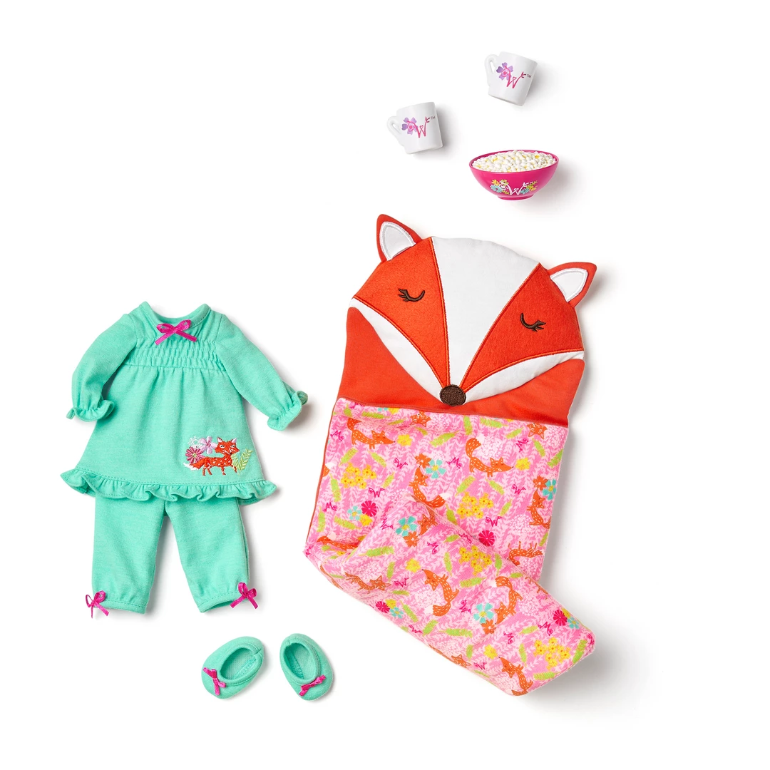 Everything she needs for a snuggly slumber party with her WellieWishers™ doll! This set features a sleeping bag, two cocoa mugs, a popcorn bowl, and doll-sized pajamas and slippers.